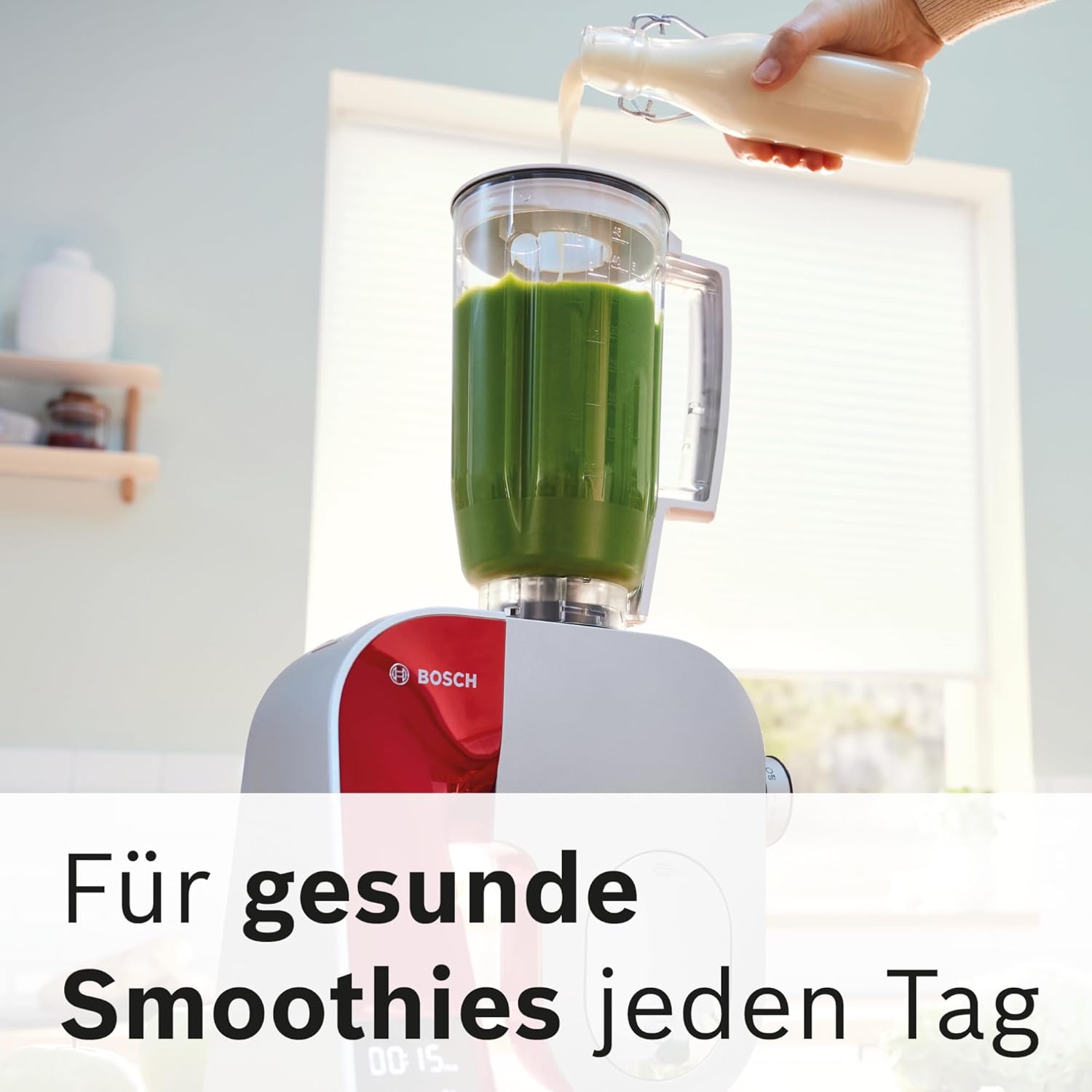 Кухненски робот Bosch MUM5X720 серия 4, вградени везни, купа от неръждаема стомана 3,9 л, миксер 1,25 л, професионална кука за тесто, бъркалка, подходяща за съдомиялна машина, шредер за непрекъснато движение, 1000 W, тъмночервен