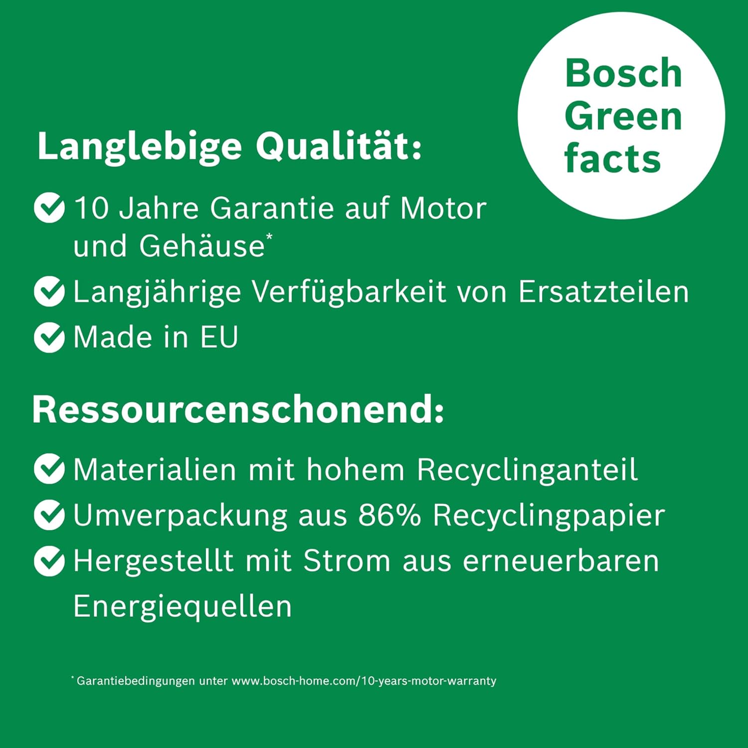 Die Motortechnologie von Bosch verspricht lang anhaltende Leistung. Mit der kostenlosen 10 Jahre Motor- und Gehäusegarantie kannst du die Zubereitung zahlloser Mahlzeiten mit deinem treuen Küchenhelfer genießen.