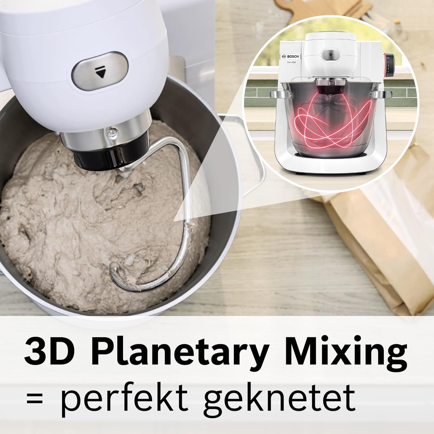 При месене на тесто, мощният 1600-ватов мотор с въздушно охлаждане и 3D планетарната система за смесване осигуряват перфектни резултати – дори при големи количества.