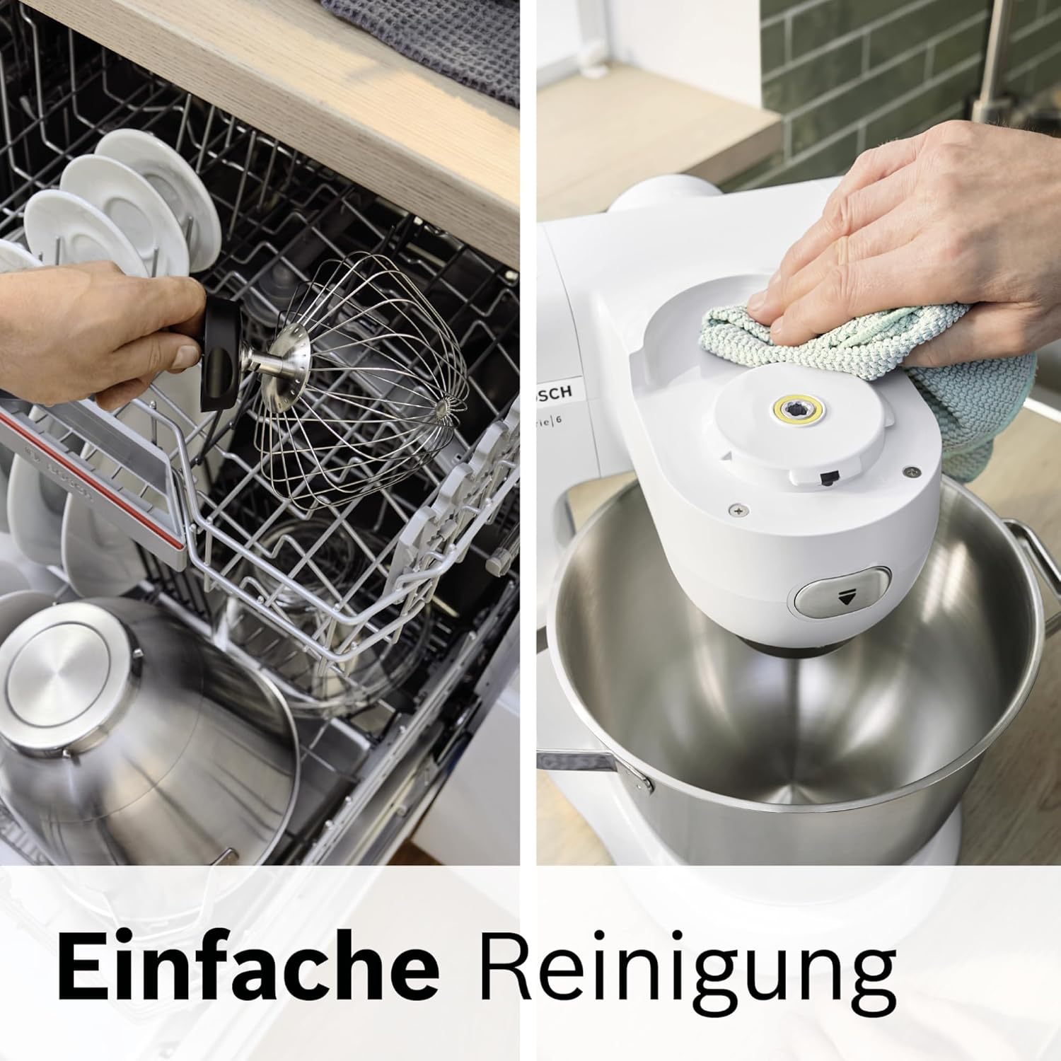 Das ausgeklügelte Design der Küchenmaschine ermöglicht eine einfache und gründliche Reinigung. Fast alle Teile wie Rührwerkzeuge, Schüssel oder Reibescheiben sind spülmaschinenfest – außer Fleischwolf und Pastawalzen.