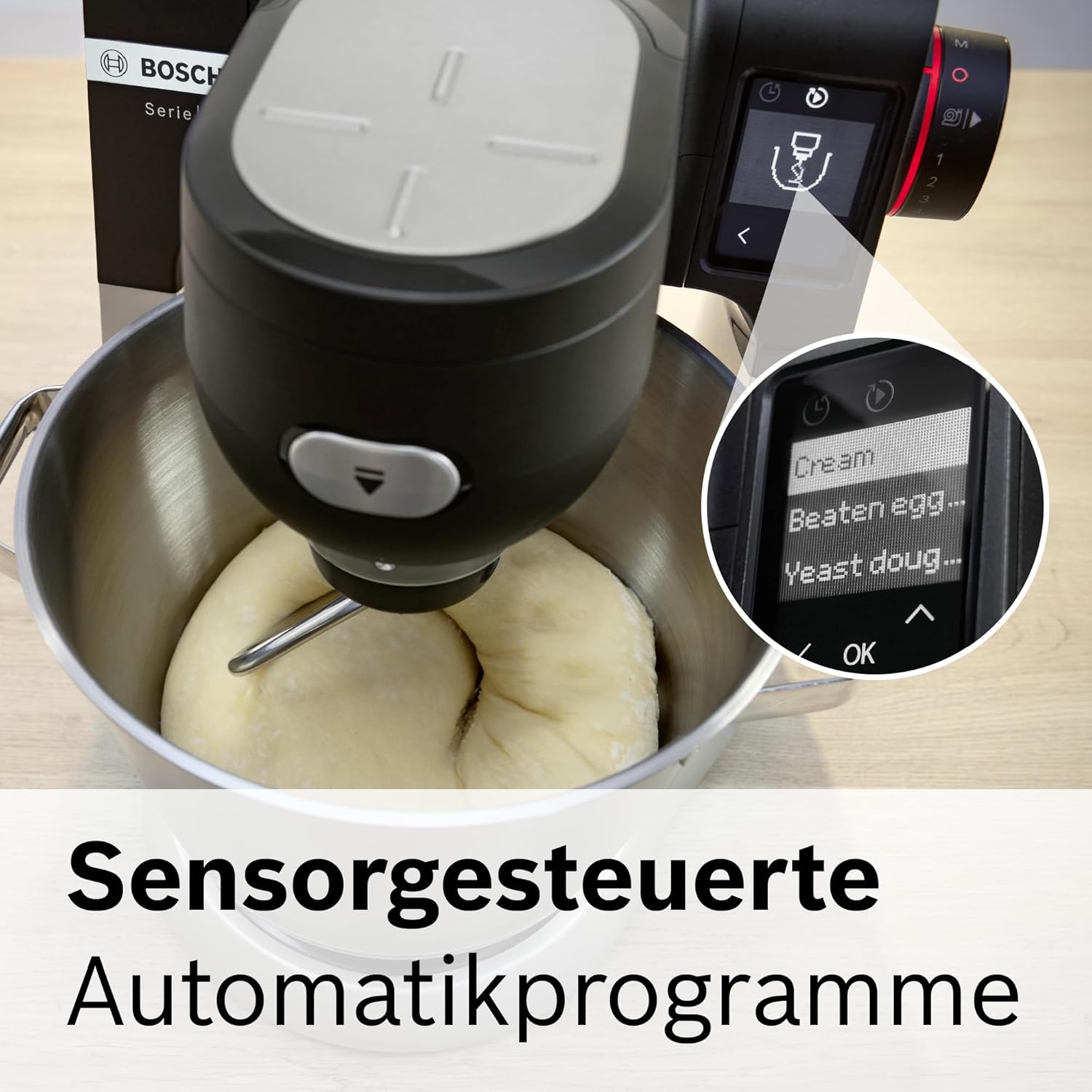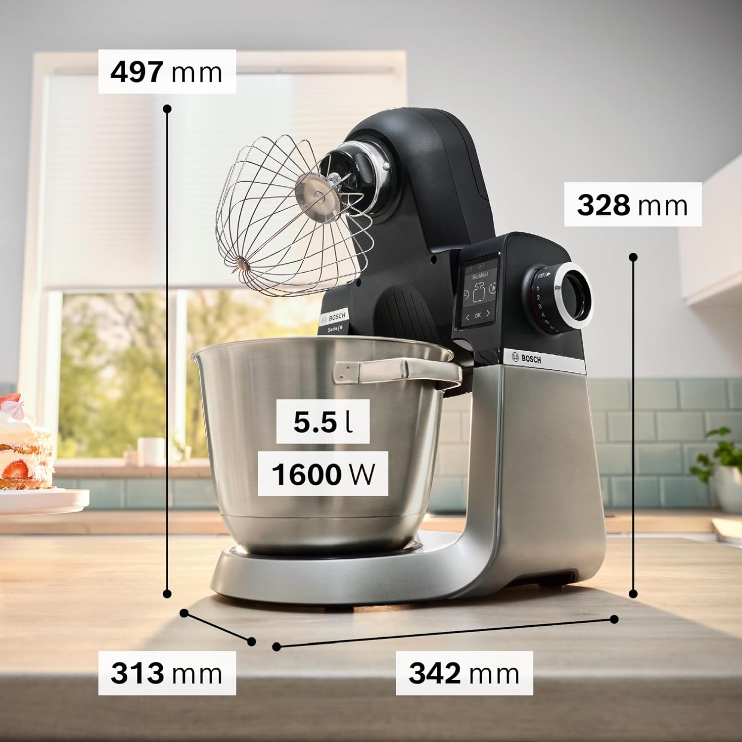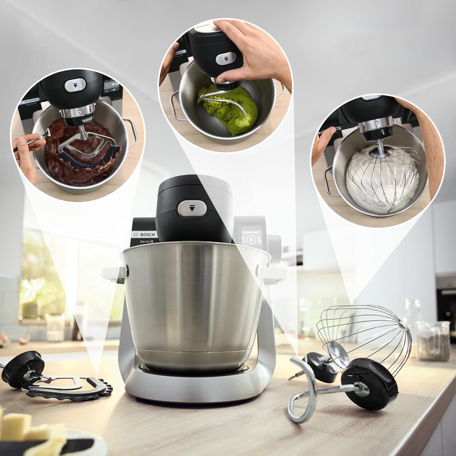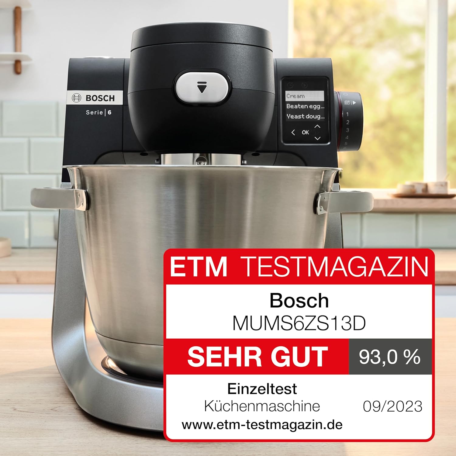 Кухненски робот Bosch MUMS6ZS13D Серия 6, 7 автоматични програми, вградена везна, купа 5,5 л, шредер за непрекъснато рязане, филии, кука за тесто/бъркалка/силиконова бъркалка, подходящ за съдомиялна машина, 1600 W, сребрист/черен