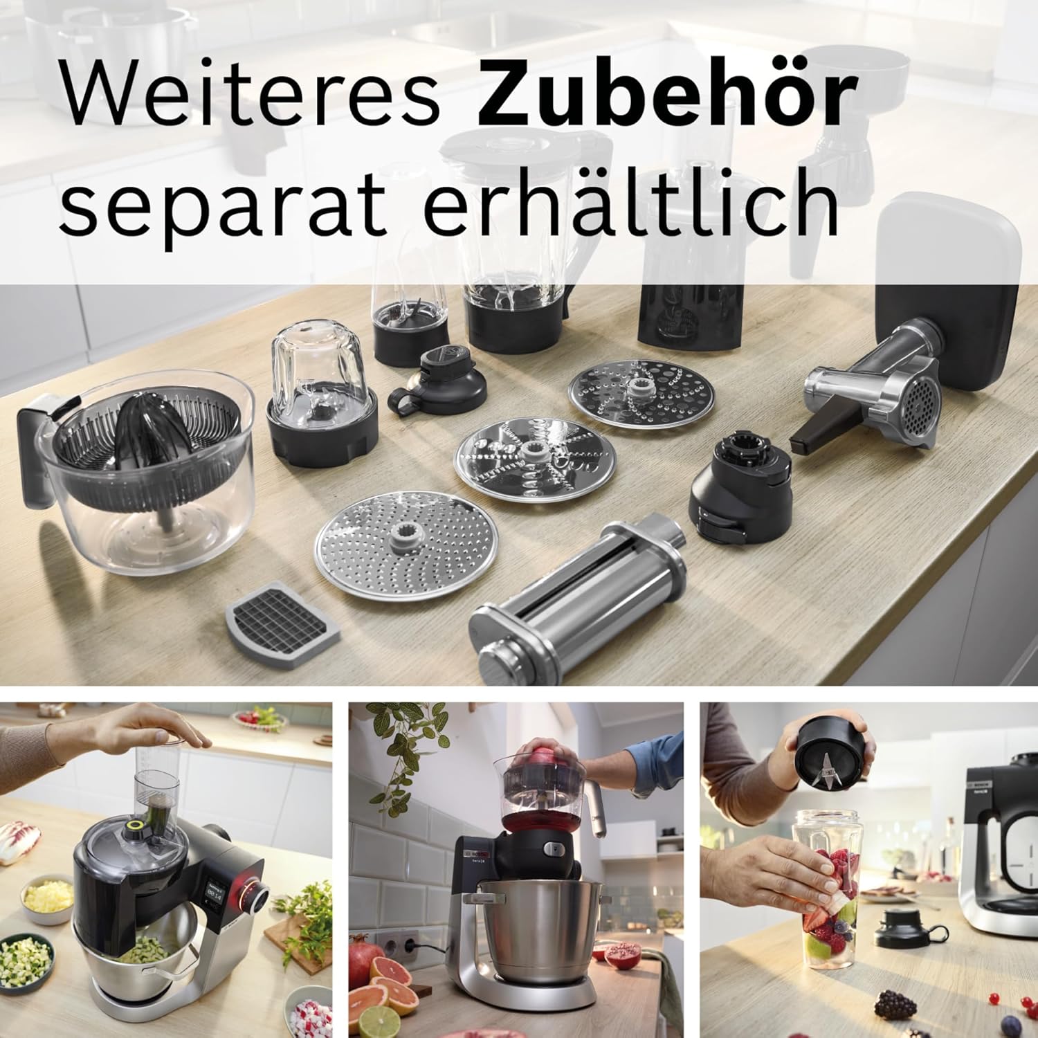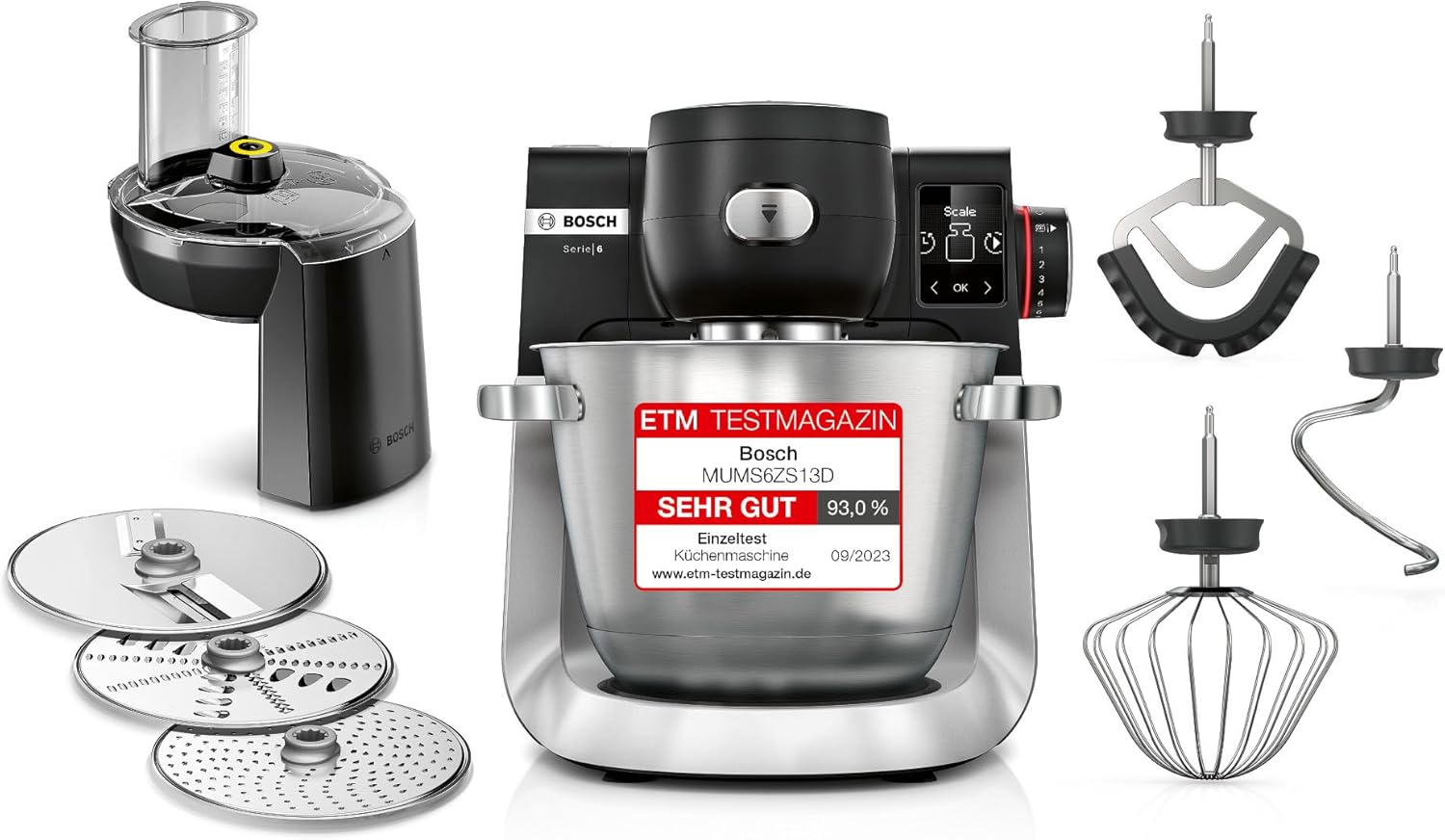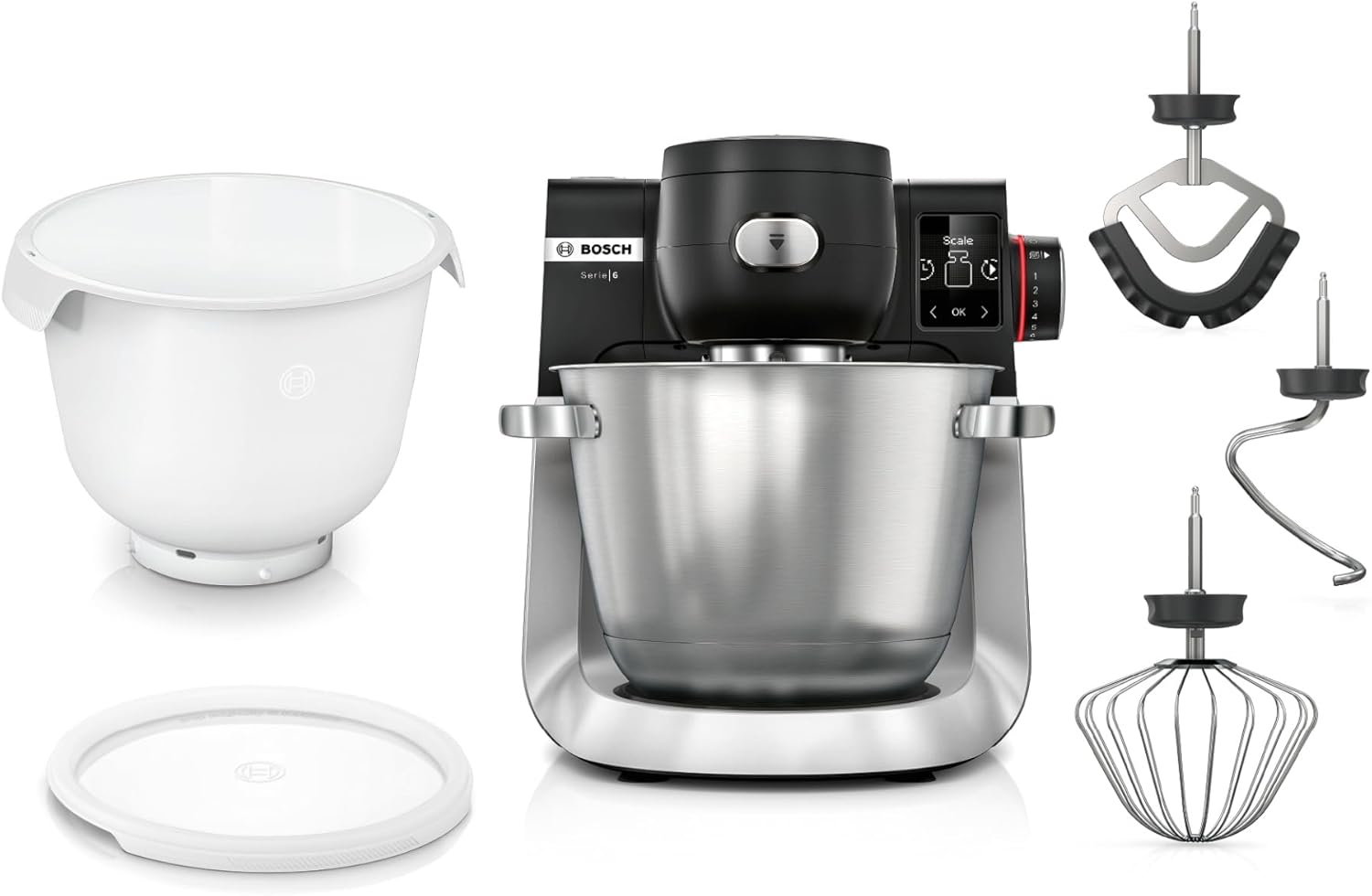 Кухненски робот Bosch MUMS6ZS18 серия 6, 2 купи 5.5 л (неръждаема стомана, пластмаса), вградена везна, 7 автоматични програми, 7 нива, планетарен миксер, кука за тесто/миксер/силиконова бъркалка, подходящ за съдомиялна машина