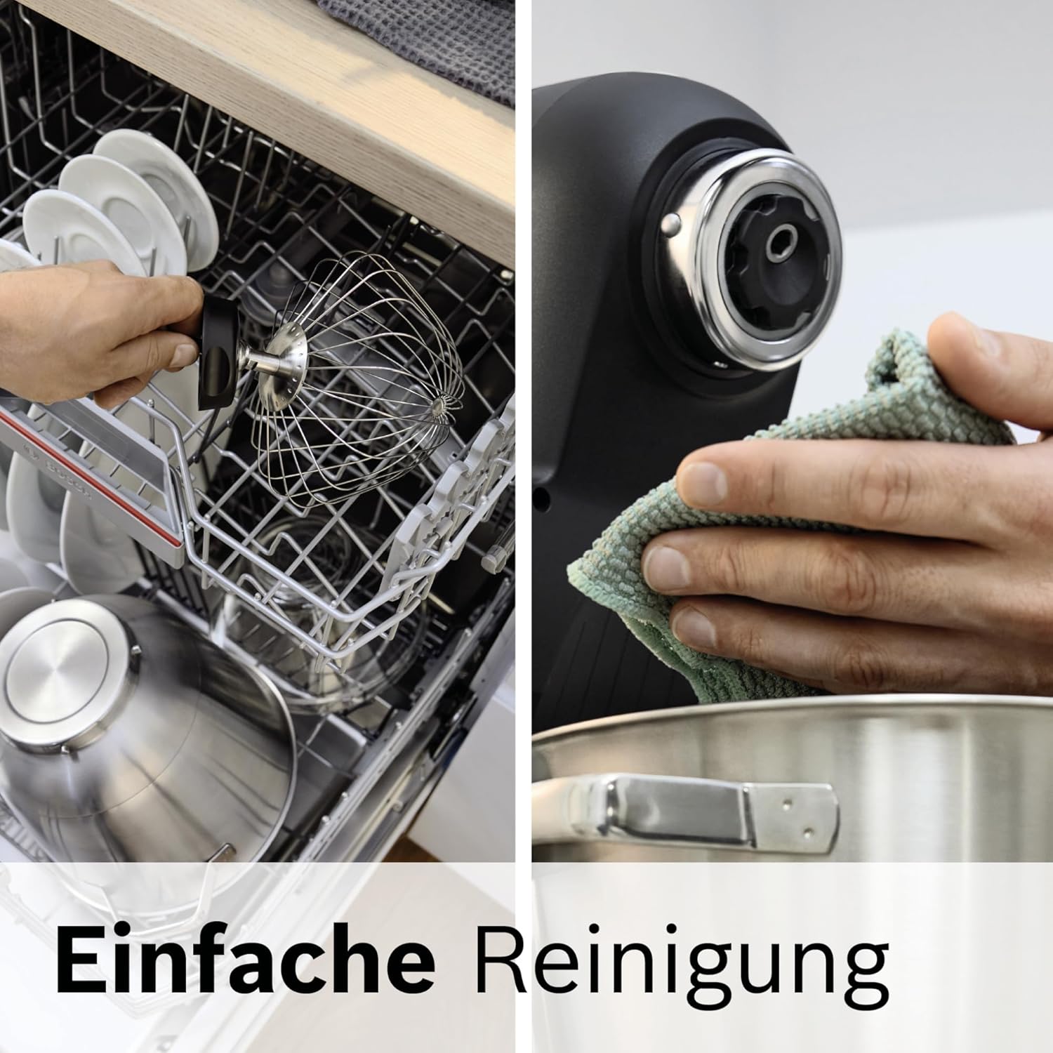 • Изключително голяма купа от неръждаема стомана с матово покритие с обем 5,5 литра: идеална за приготвяне на големи количества тесто, например 3,5 кг тесто за кекс, наведнъж