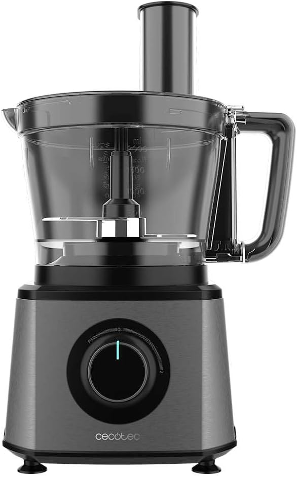 Кухненски робот Cecotec Comino 1000. 1000 W, 2 скорости и импулсен режим, купа 2 л и кана 1,8 л, 3 режещи диска, сатъри, нож за месене, сокоизстисквачка и диск за сметана.