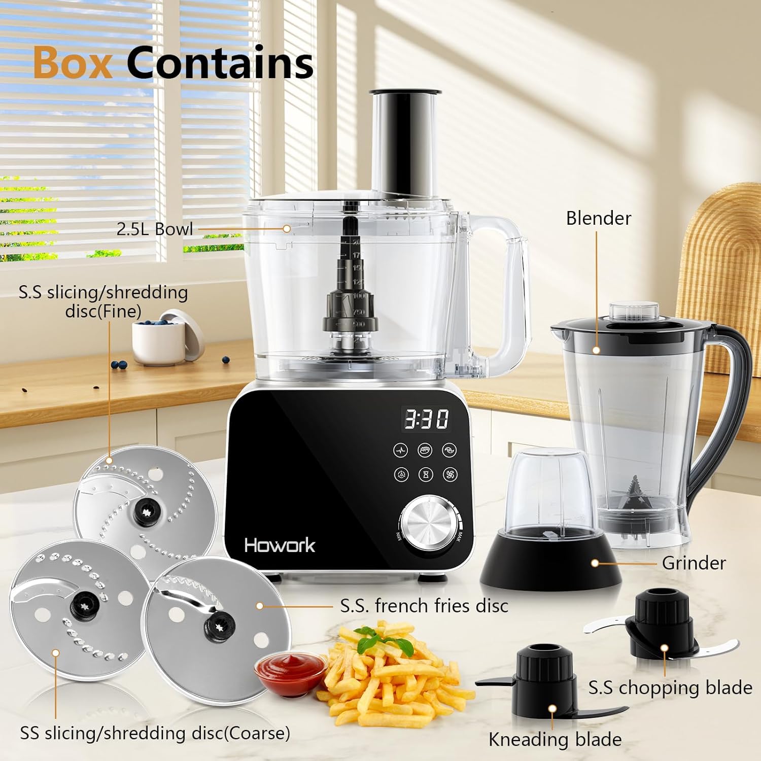 Кухненски робот Howork 1500 W, многофункционален с голям капацитет, за рязане, нарязване, смилане, смутита, кълцане, пълнене и тесто, неръждаема стомана, сребрист