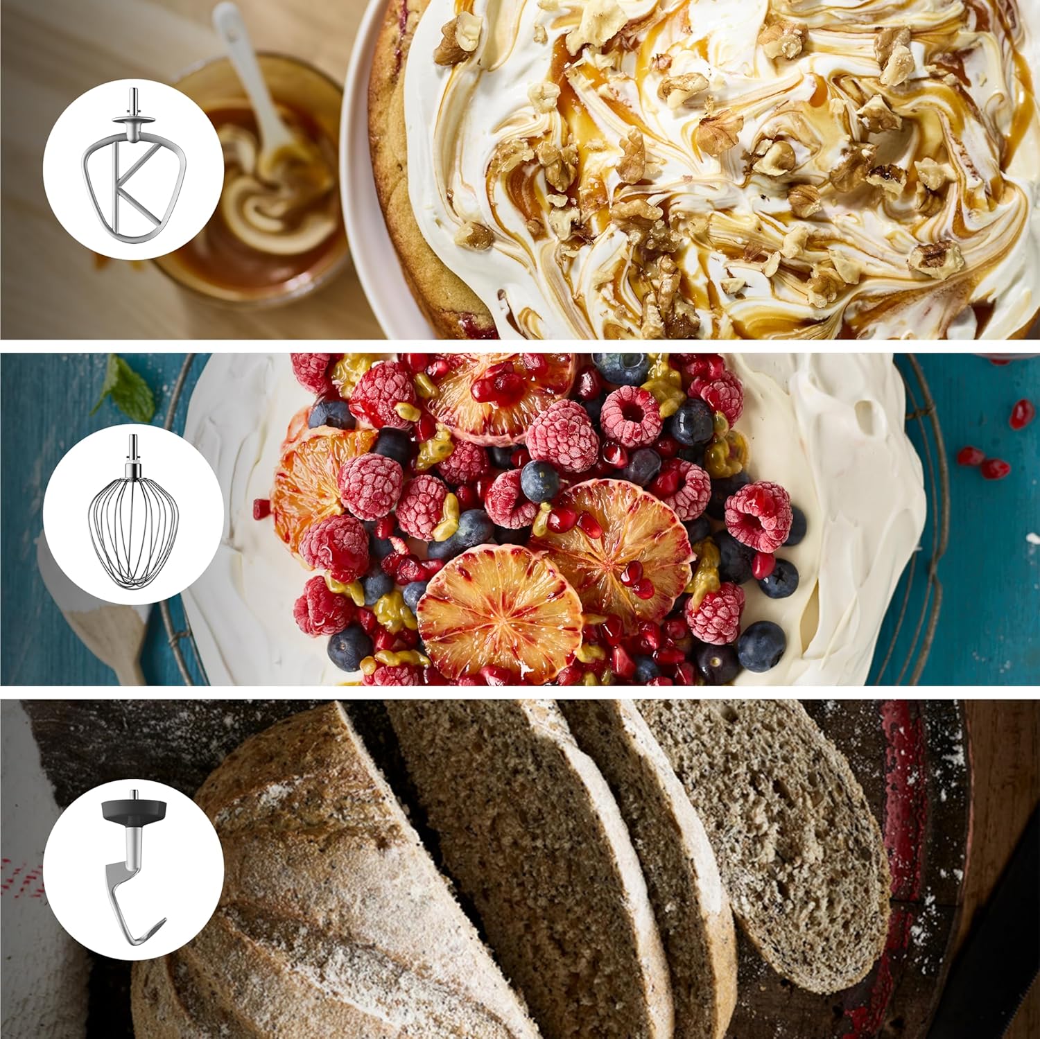 • Включени аксесоари: Комплект за сладкарски изделия от 3 части, състоящ се от K-образна кука, бъркалка и кука за тесто.