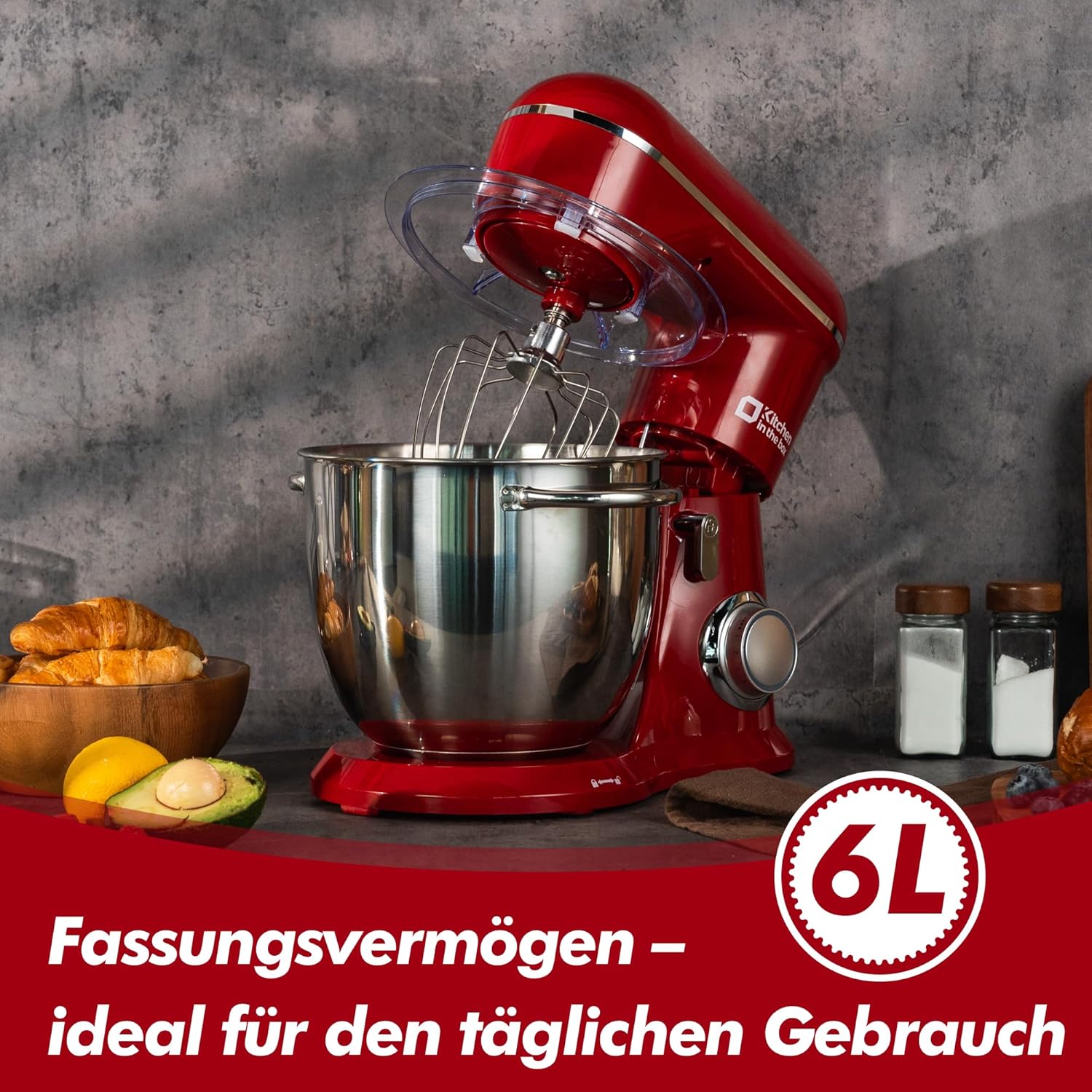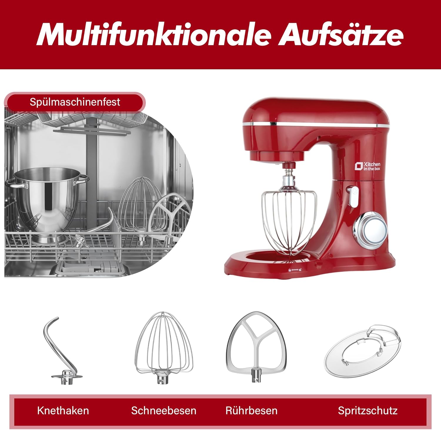 Кухненски робот Kitchen in the box 1300 W, 6 л, машина за месене на тесто за домашно печене, 10-скоростна машина за смесване с кука за тесто, бъркалка и кука за смесване, червена