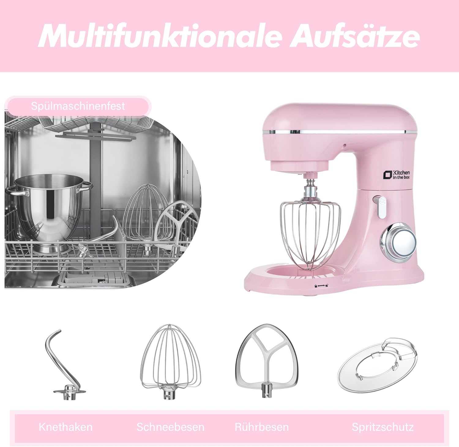 Кухненски робот Kitchen in the box 1300 W, 6 л, машина за месене на тесто за домашно печене, 10-скоростна машина за смесване с кука за тесто, бъркалка и кука за смесване, розов