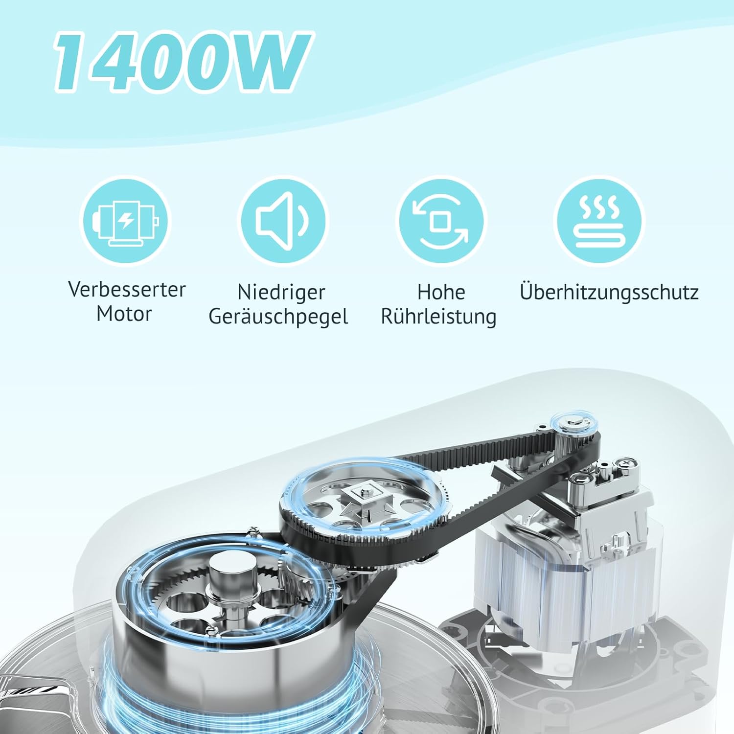 • Мощност 1400 W Машината за месене има двигател с мощност 1400 W с висока ефективност. Двигателите от чиста мед имат добра електрическа проводимост, не са склонни към нагряване, имат ниска консумация на енергия, стабилна работа и дълъг експлоатационен живот.