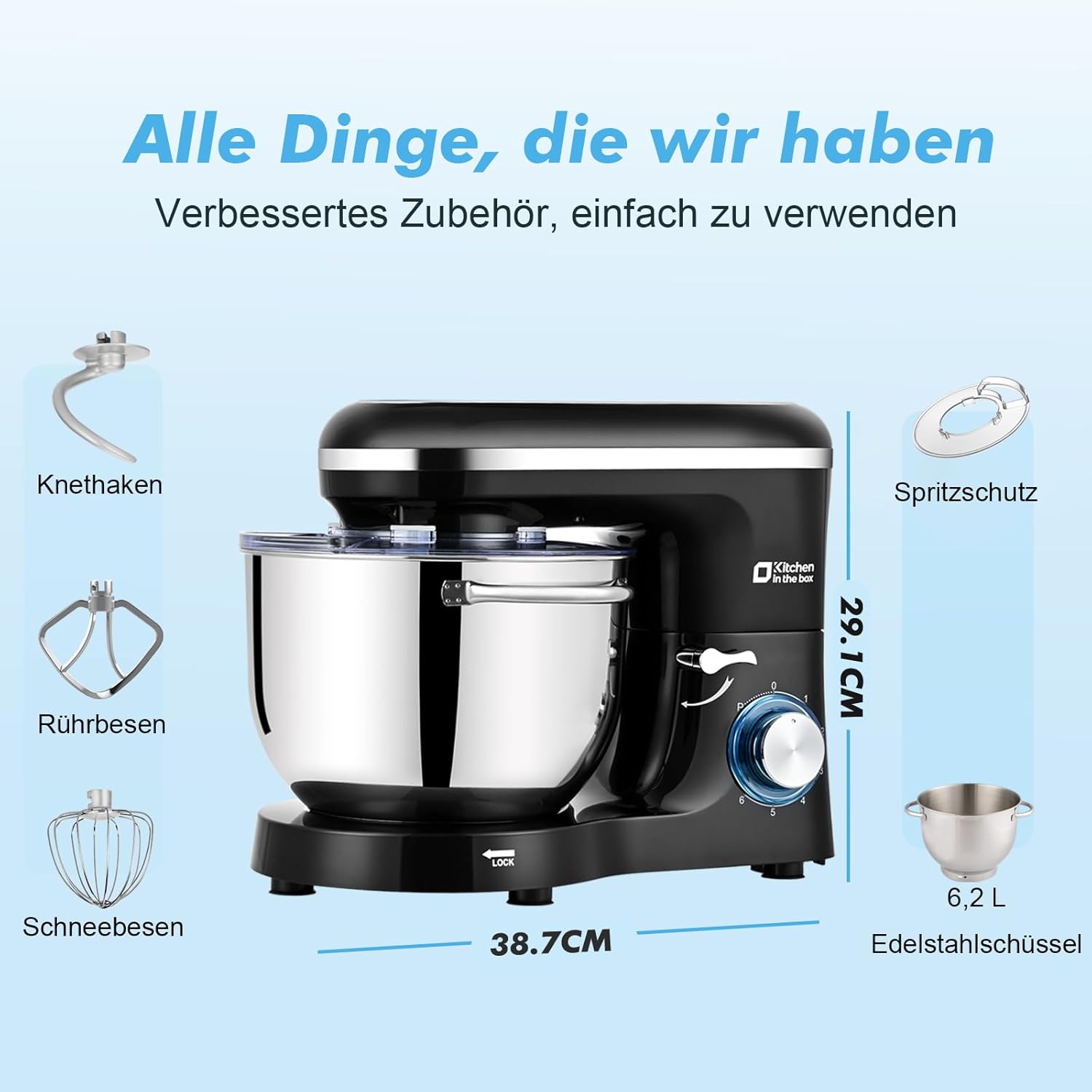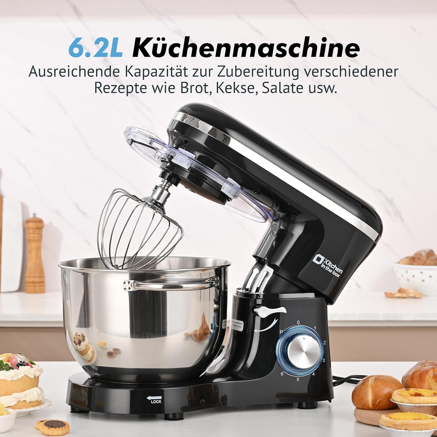 Кухненски робот Kitchen in the box, 6.2 л машина за месене 1400 W, 6 скорости машина за тесто с кука за смесване, кука за тесто, бъркалка, черен