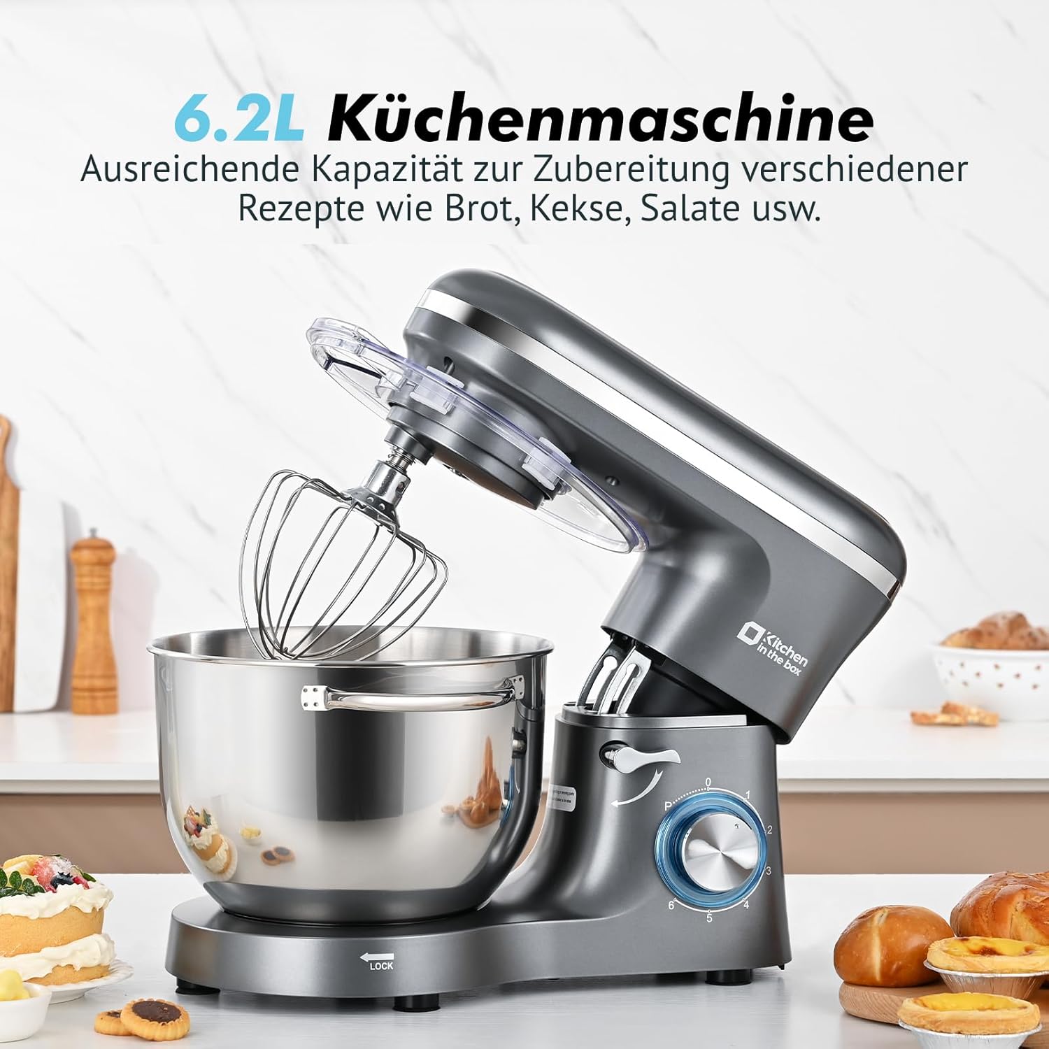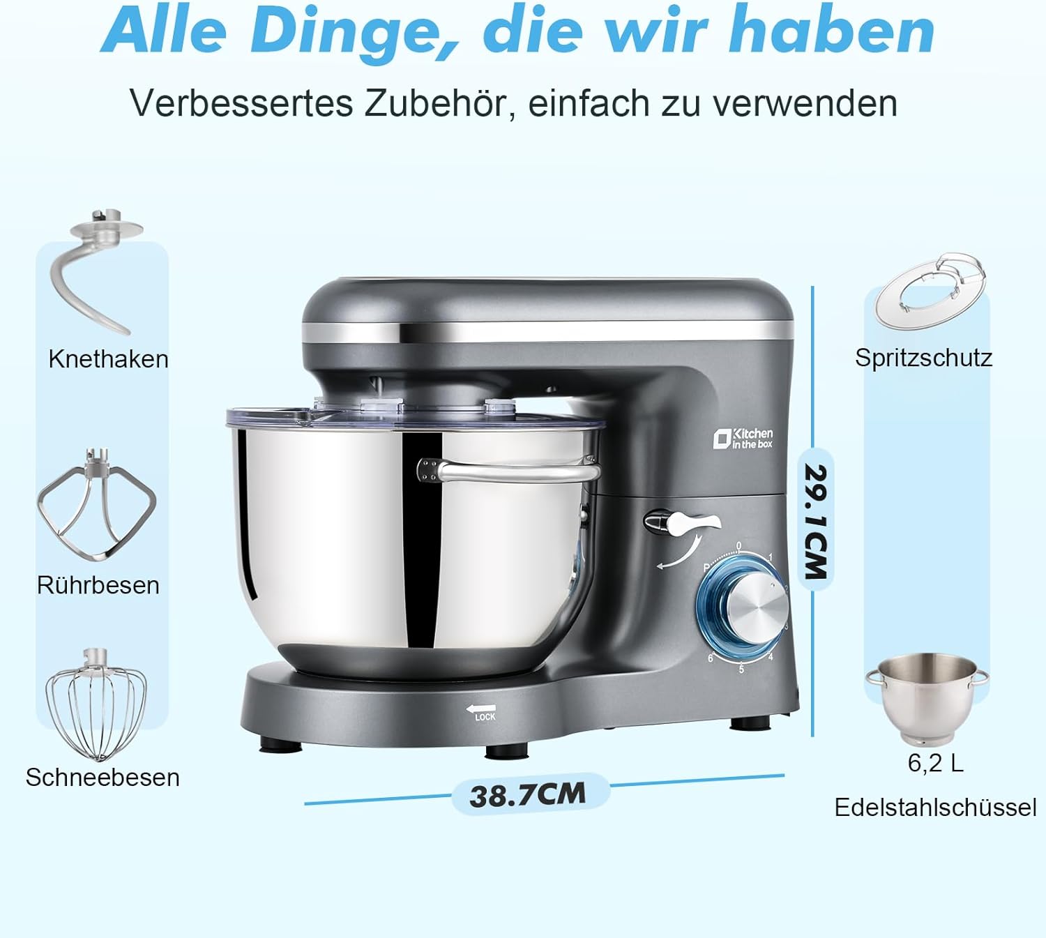 Кухненски робот Kitchen in the box, 6.2 л машина за месене 1400 W, 6 скорости машина за тесто с кука за смесване, кука за тесто, бъркалка, сив