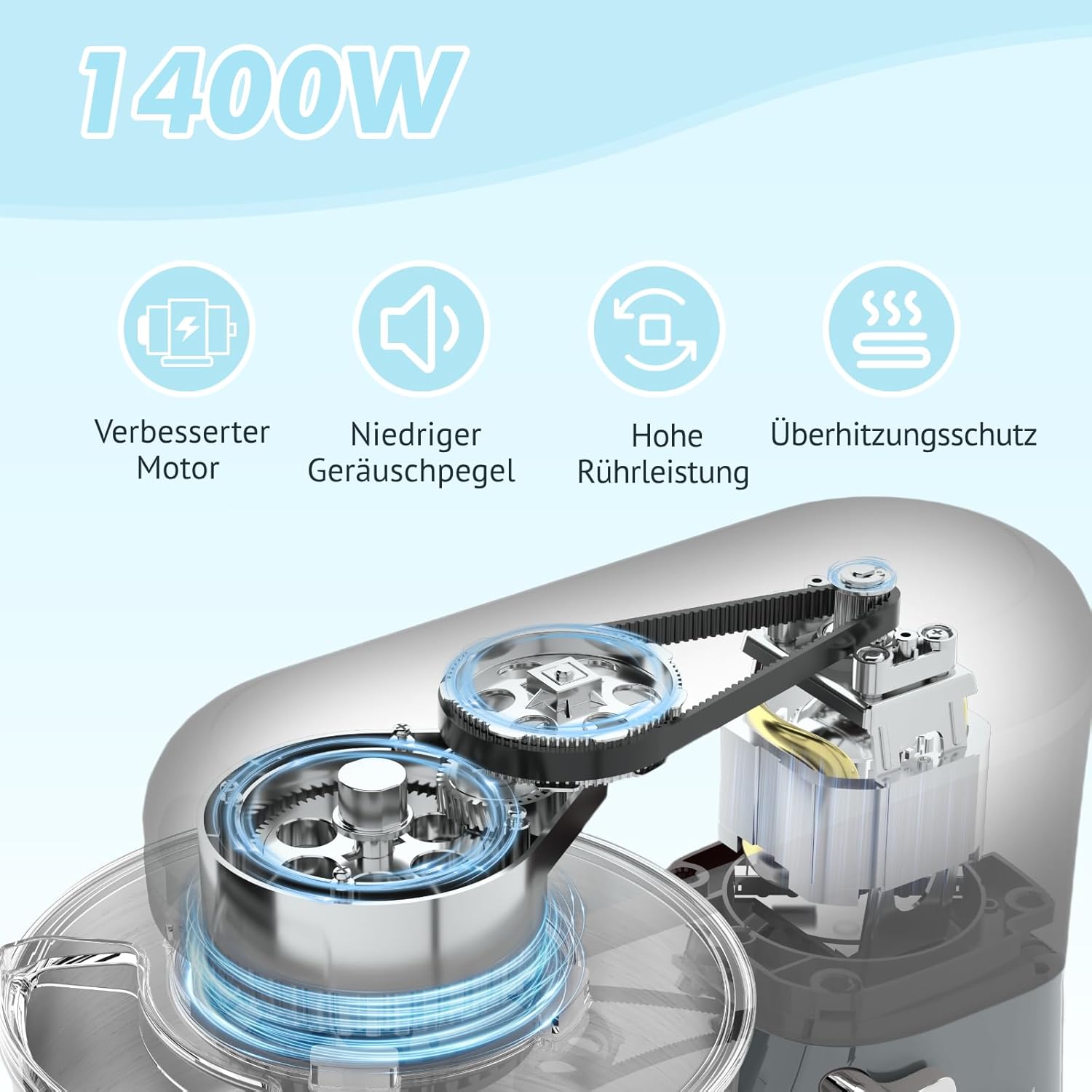• Мощност 1400 W Машината за месене има двигател с мощност 1400 W с висока ефективност. Двигателите от чиста мед имат добра електрическа проводимост, не са склонни към нагряване, имат ниска консумация на енергия, стабилна работа и дълъг експлоатационен живот.