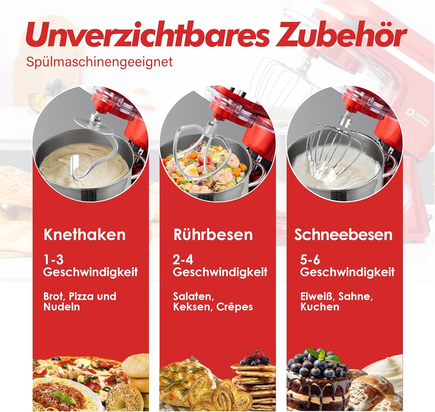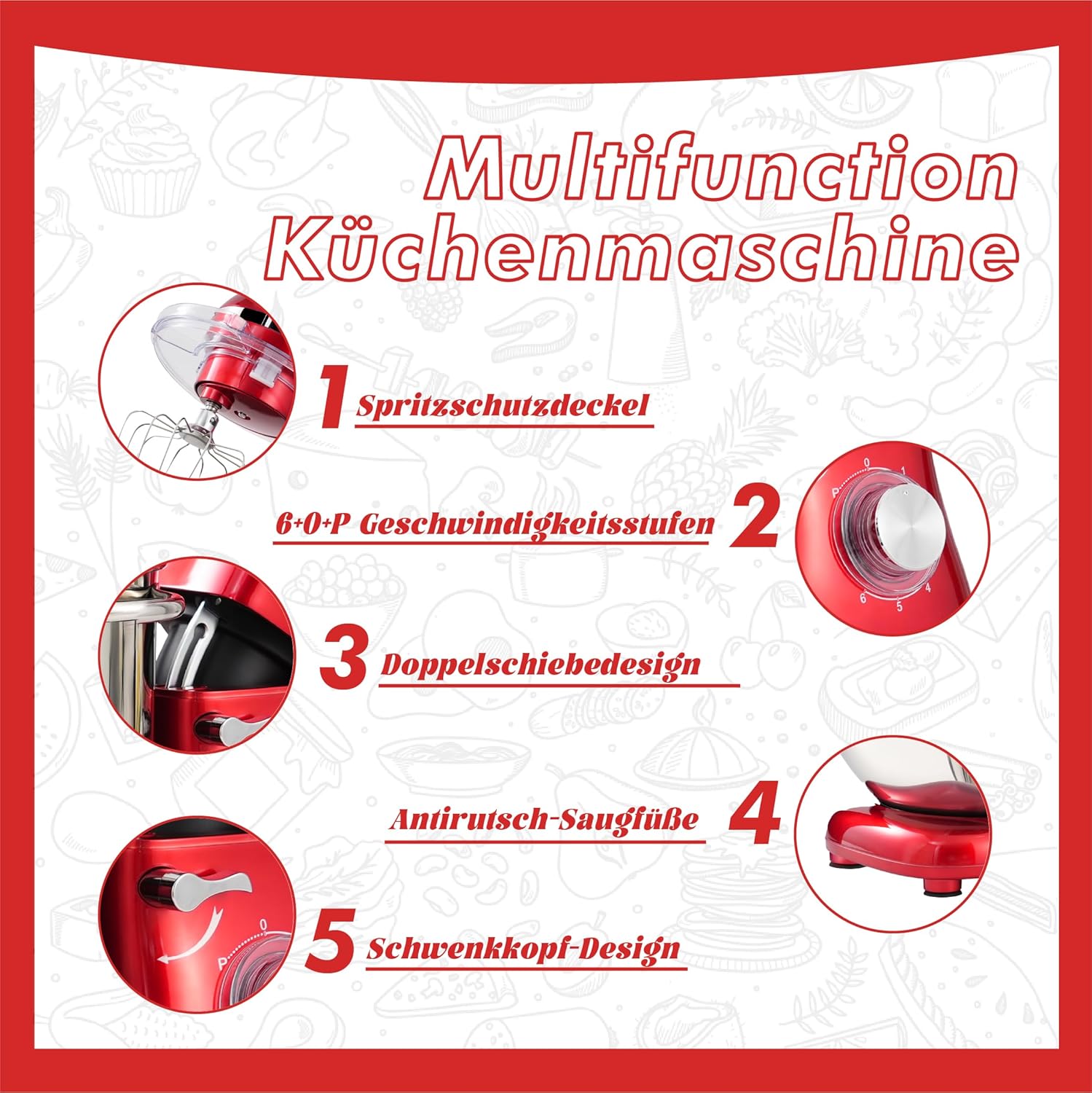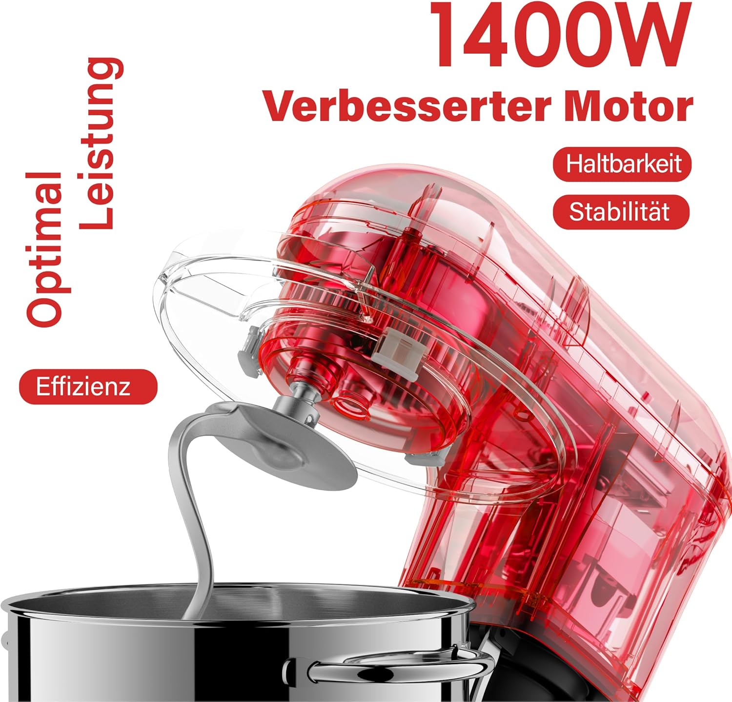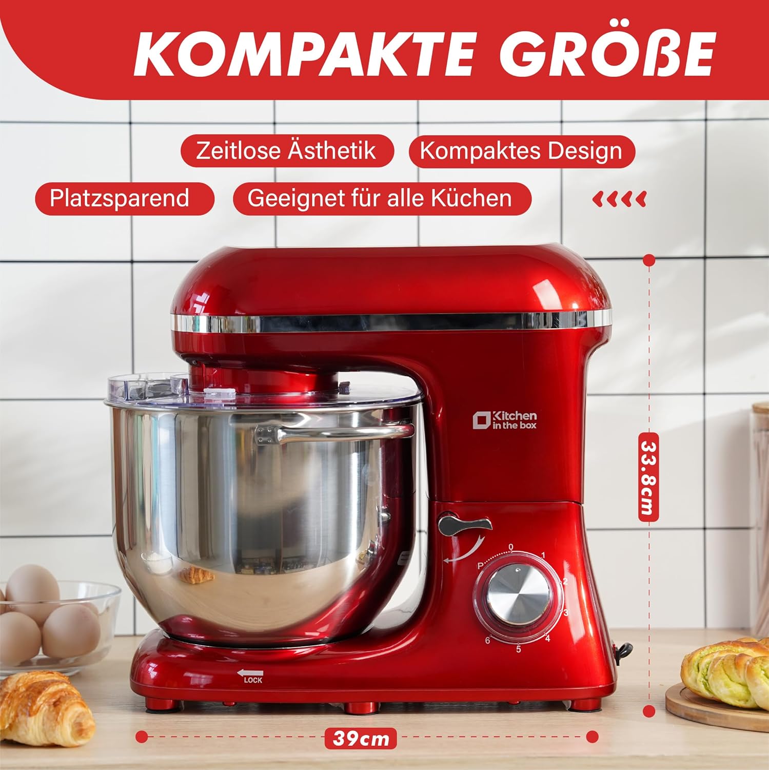 Кухненски робот Kitchen in the box, 7.5 л машина за месене 1400 W, 6 скорости машина за тесто с кука за смесване, кука за тесто, бъркалка, червен