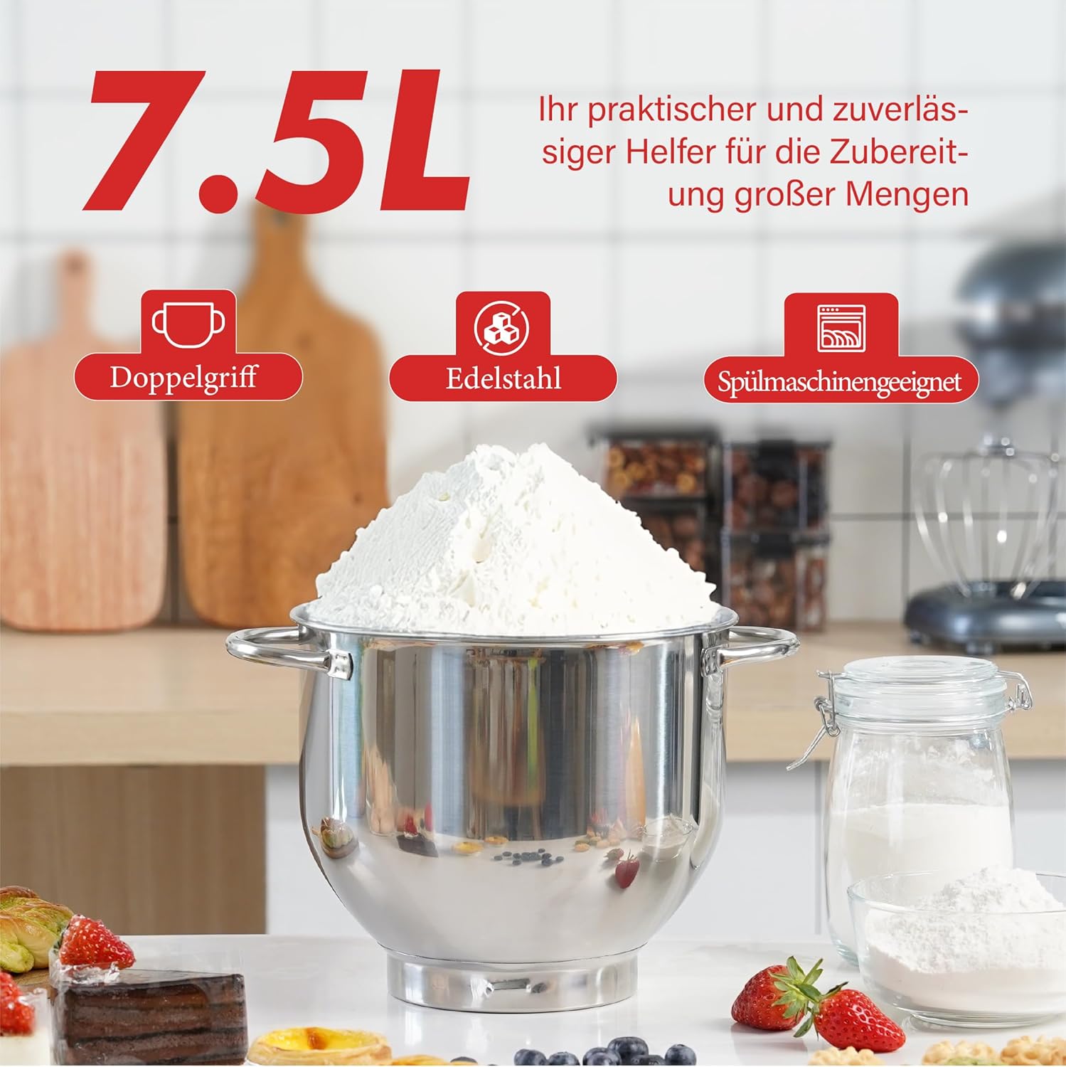 • Аксесоарите са издръжливи и подходящи за съдомиялна машина: всяка машина за тесто се предлага с три аксесоара: кука за тесто, кука за разбъркване и бъркалка. Аксесоарите са изработени от безопасен и издръжлив материал и могат да се мият в съдомиялна машина. Предпазителят от пръски с отвор за пълнене улеснява добавянето на съставки.