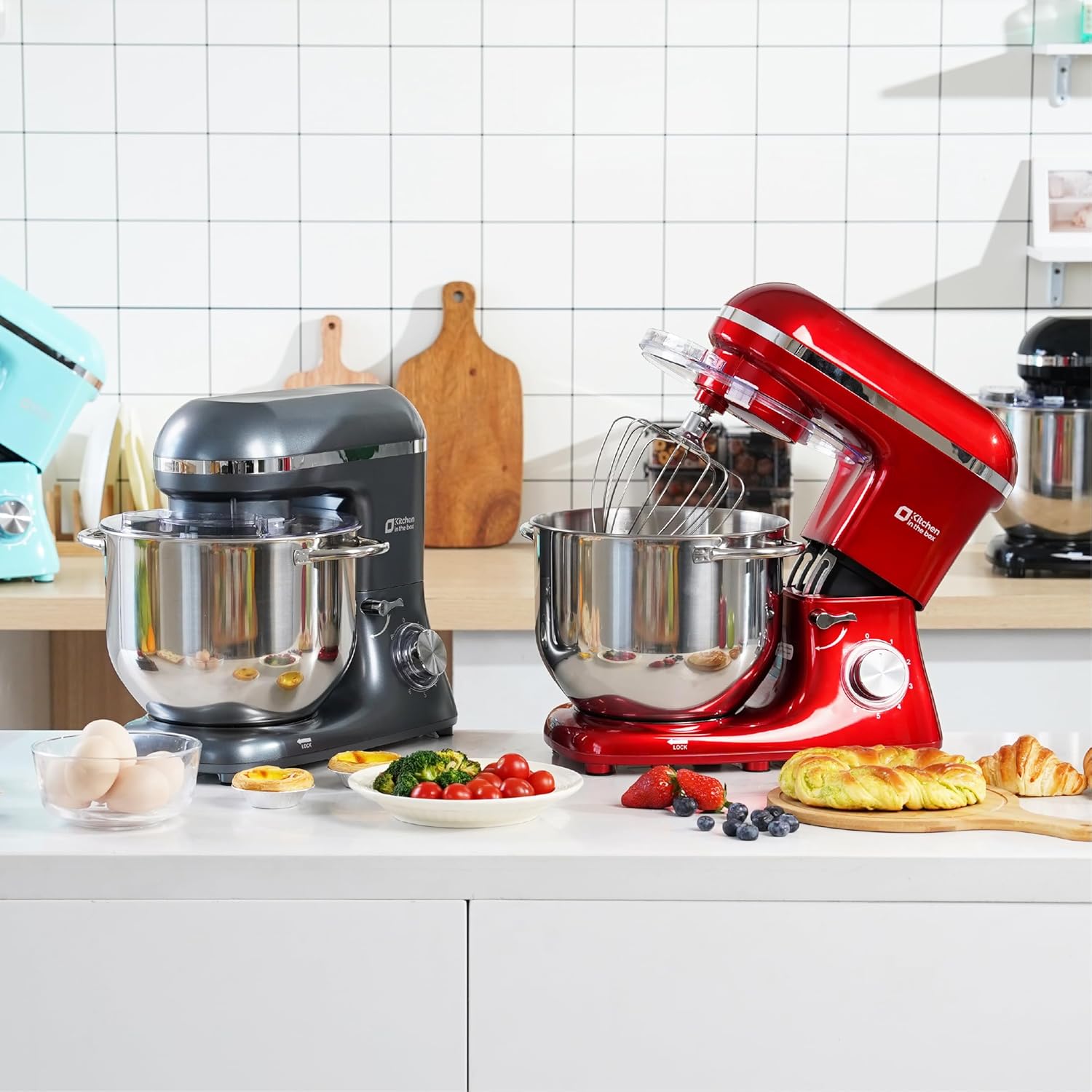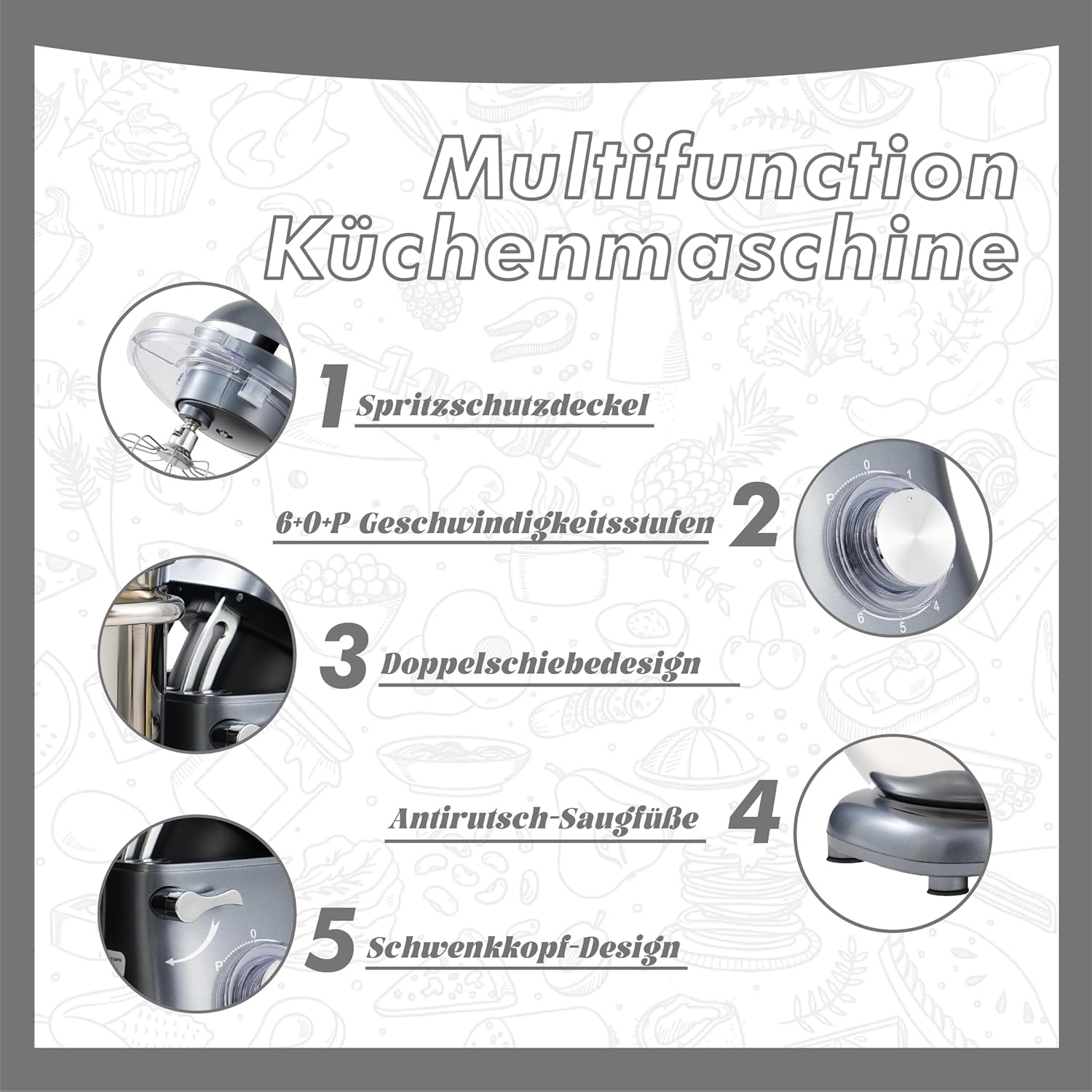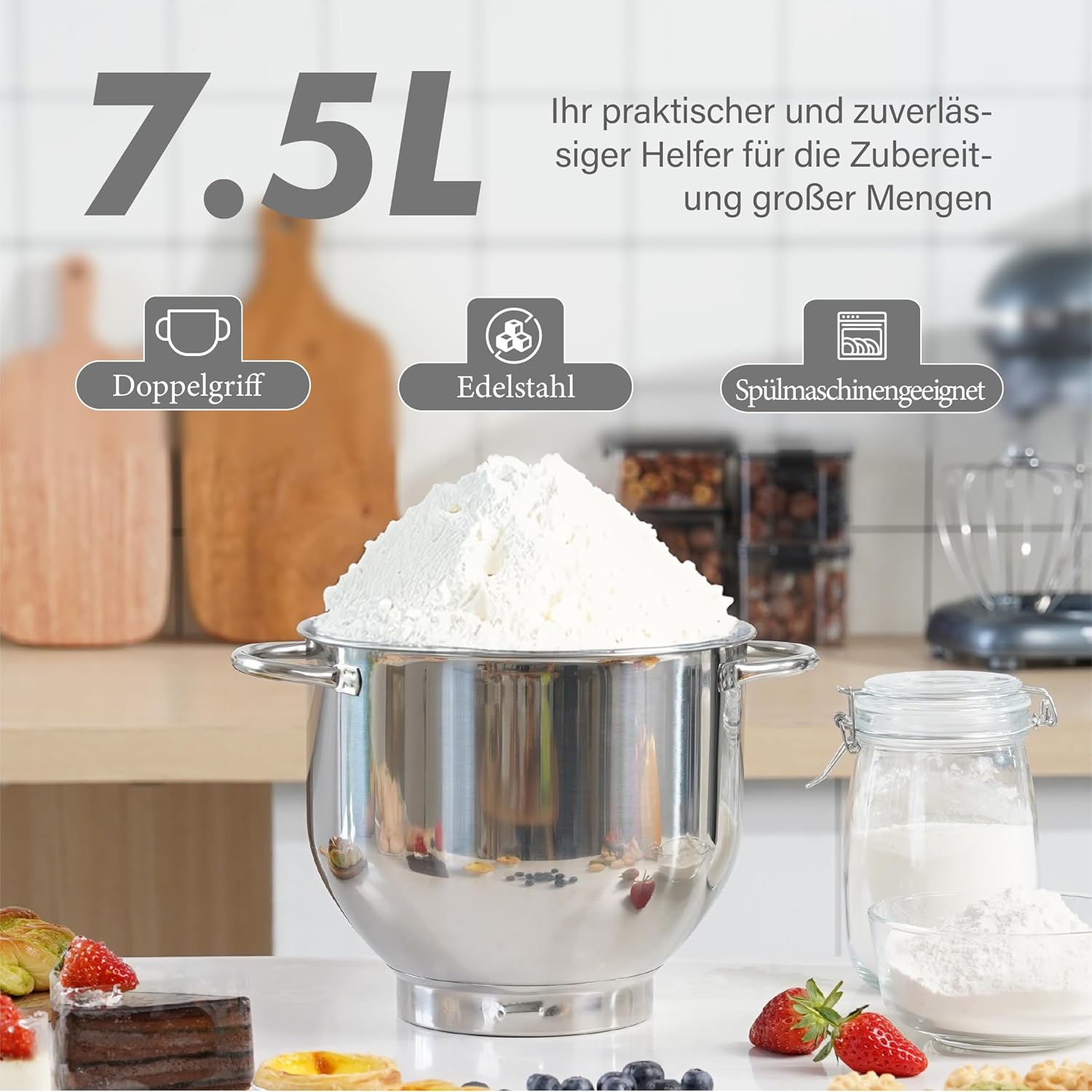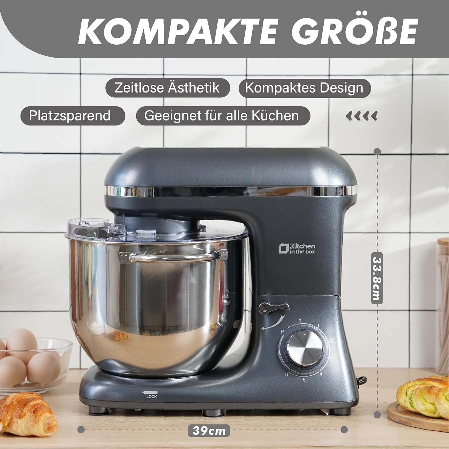 Кухненски робот Kitchen in the box, 7.5 л машина за месене 1400 W, 6 скорости машина за тесто с кука за смесване, кука за тесто, бъркалка, сив