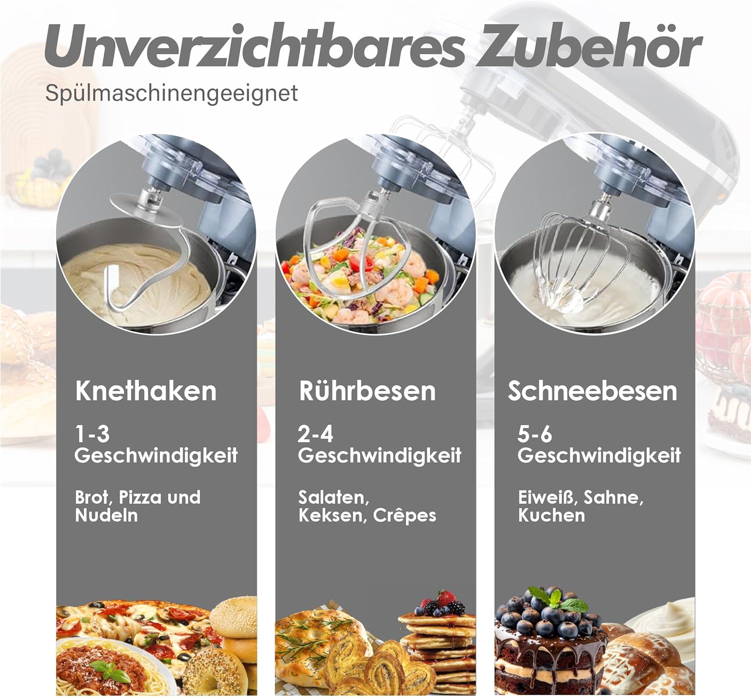 • Аксесоарите са издръжливи и подходящи за съдомиялна машина: всяка машина за тесто се предлага с три аксесоара: кука за тесто, кука за разбъркване и бъркалка. Аксесоарите са изработени от безопасен и издръжлив материал и могат да се мият в съдомиялна машина. Предпазителят от пръски с отвор за пълнене улеснява добавянето на съставки.