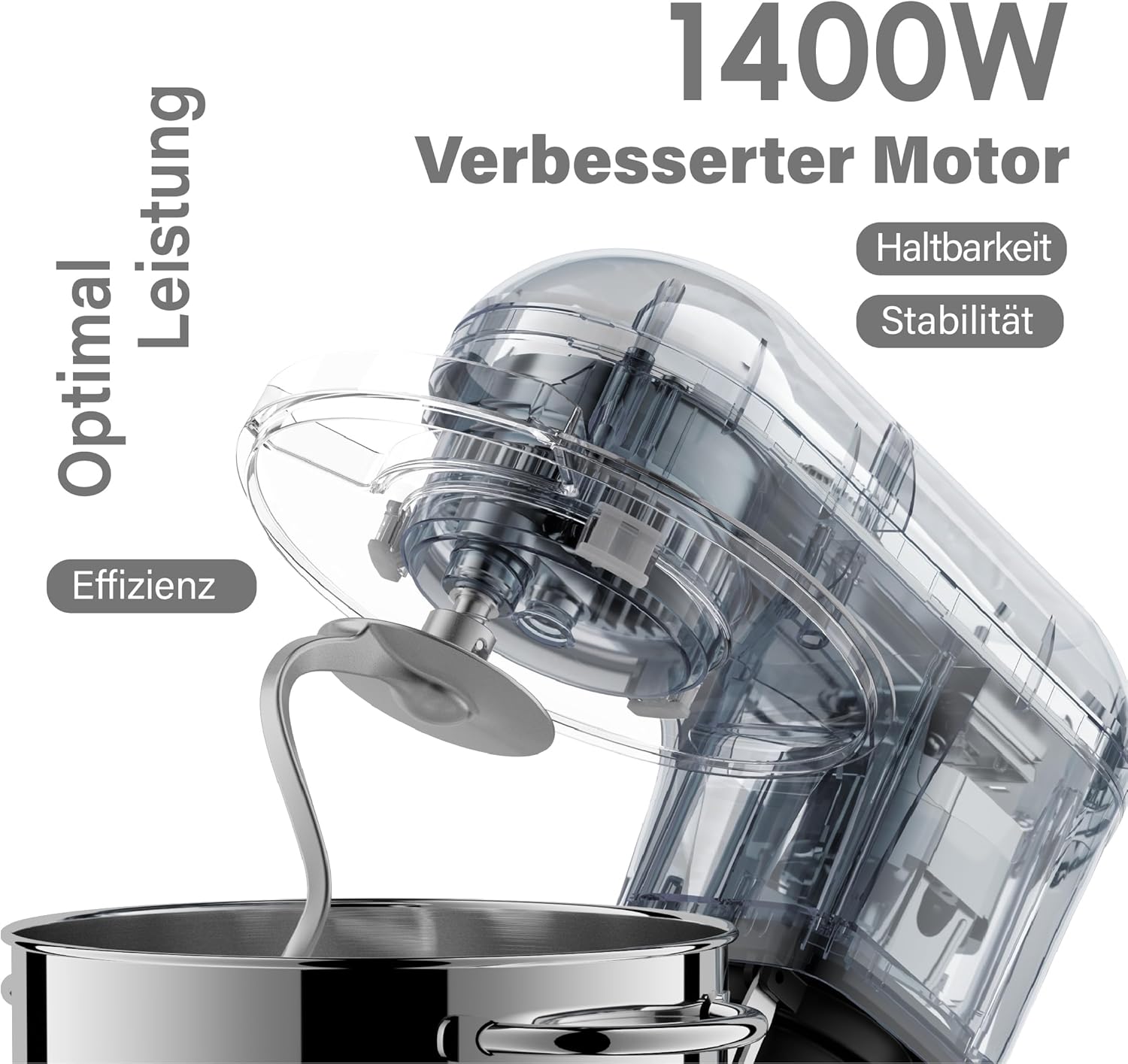 • Мощност 1400 W Машината за месене има двигател с мощност 1400 W с висока ефективност. Двигателите от чиста мед имат добра електрическа проводимост, не са склонни към нагряване, имат ниска консумация на енергия, стабилна работа и дълъг експлоатационен живот.