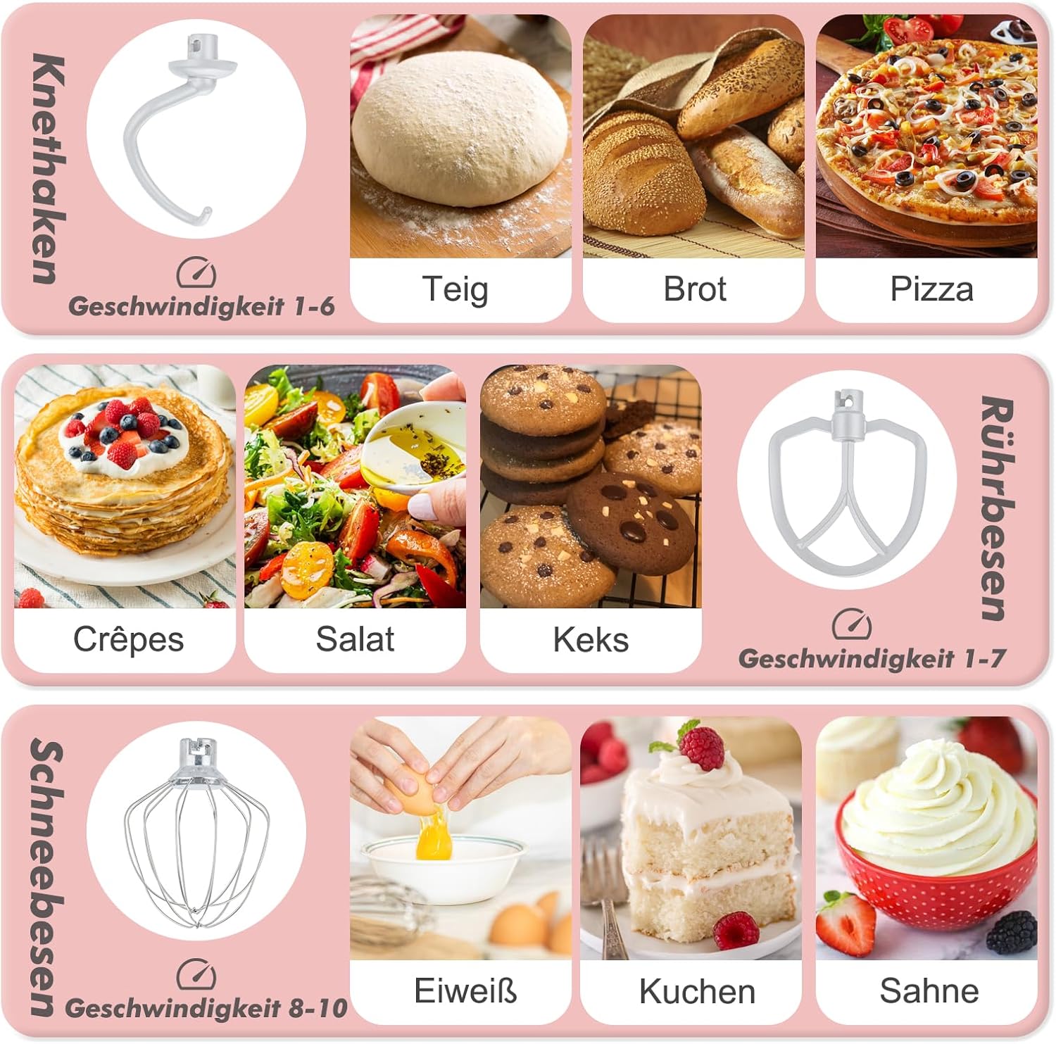 • ОБНОВЕНИ АКСЕСОАРИ ПОДХОДЯЩИ ЗА СЪДОМИЯЛНА МАШИНА Защитно покрити алуминиеви куки за тесто, куки за разбъркване и бъркалка на кухненския робот са лесни за инсталиране, както и здрави и издръжливи. Както приставките, така и купата от неръждаема стомана могат да се мият в съдомиялна машина.