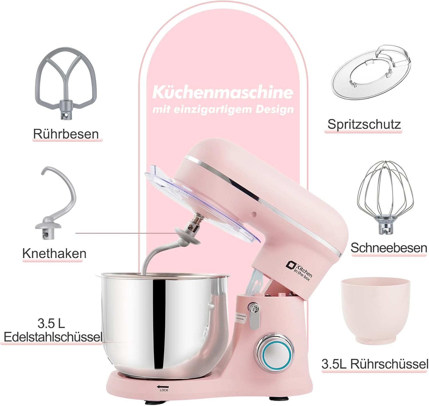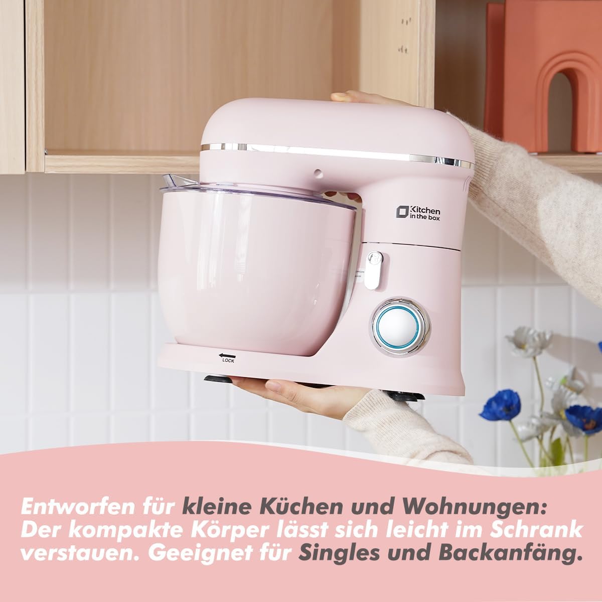 Кухненски робот Kitchen in the box, две купи по 3,5 л, малка машина за месене, преносима с 10 скорости, лека машина за тесто, матова машина за смесване с кука за тесто, бъркалка и разбиване (розов)