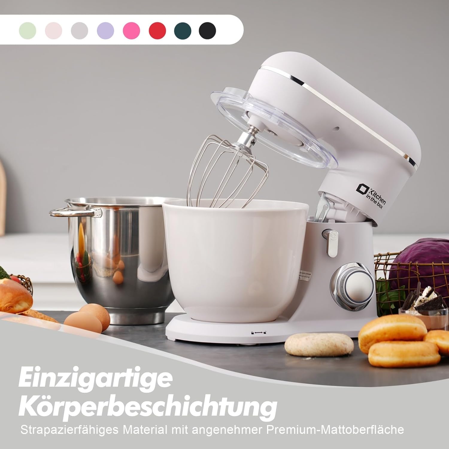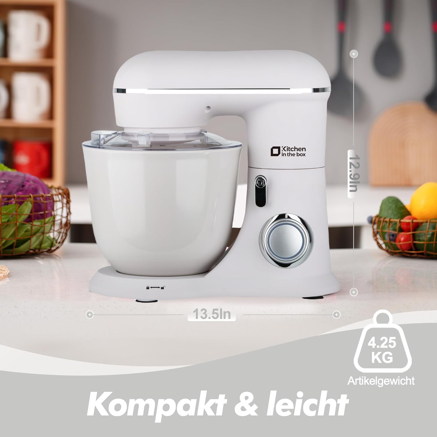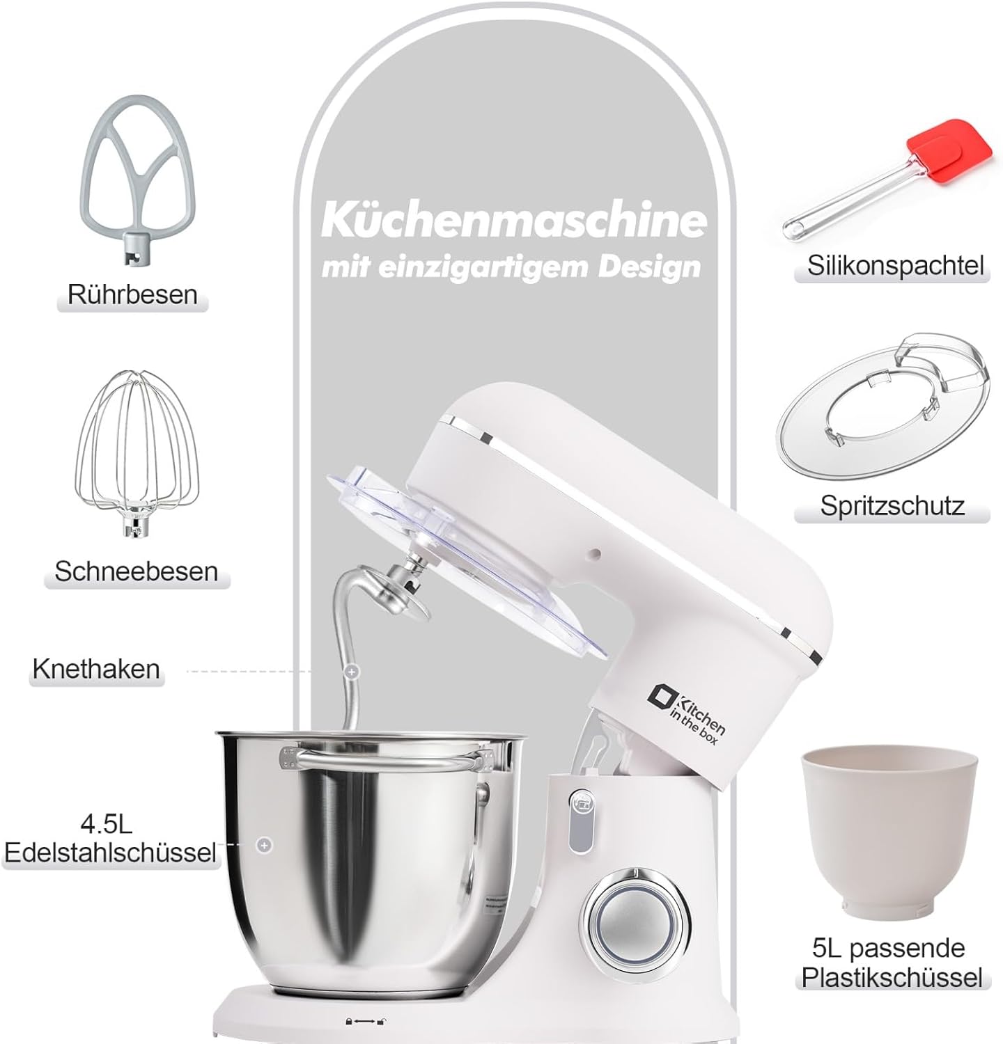 Кухненски робот Kitchen in the box, машина за месене 4,5 л и 5 л, машина за бързо тесто 10+P с кука за тесто, кука за разбъркване и бъркалка, 1300 W, бял