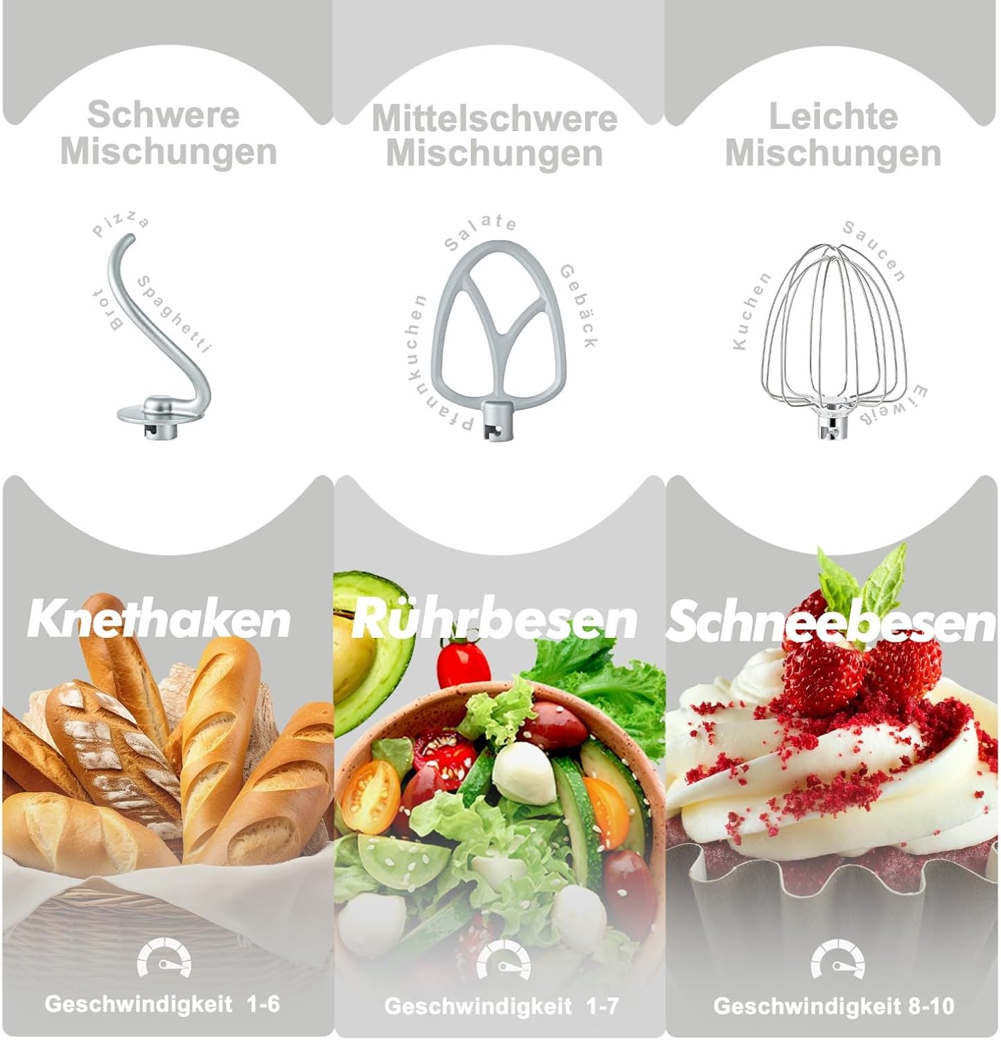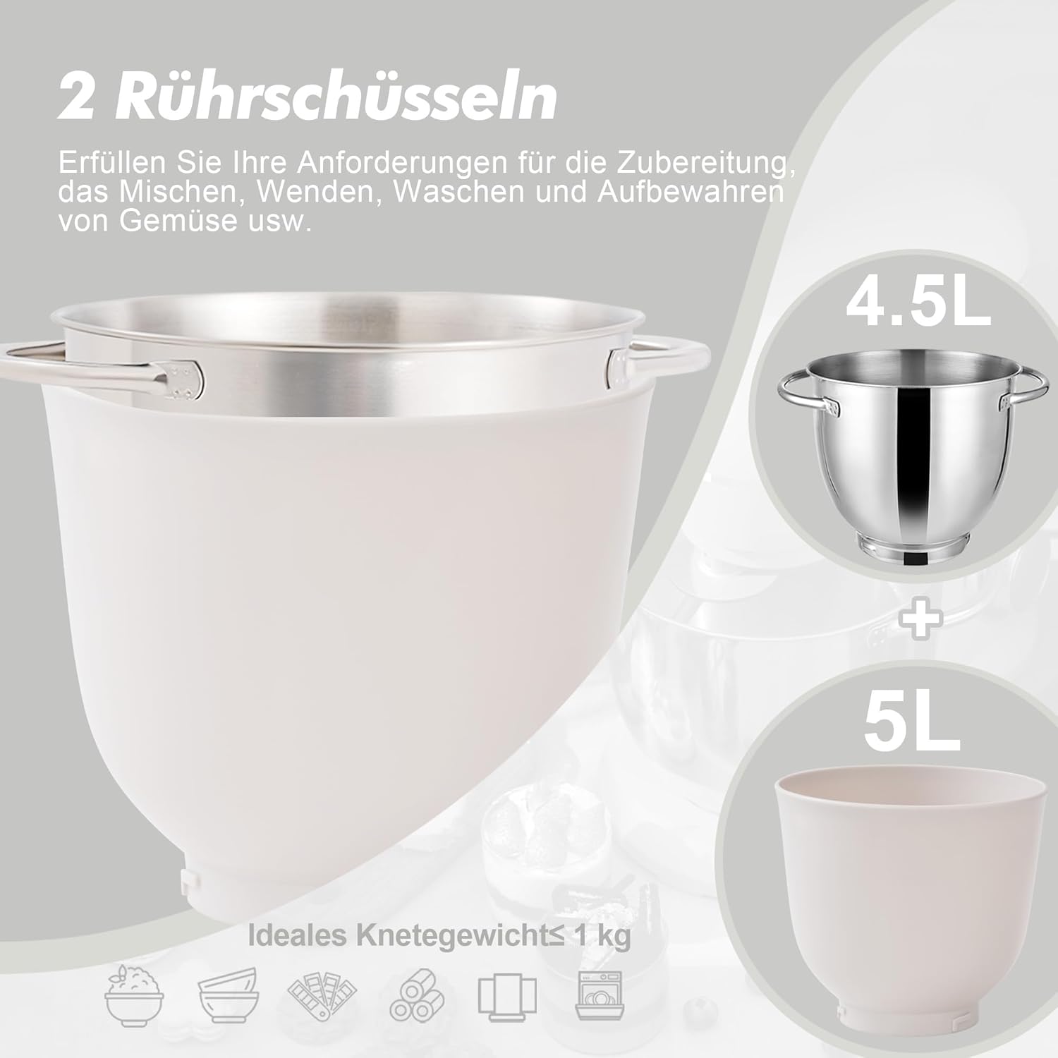 • ОБНОВЕНИ АКСЕСОАРИ ПОДХОДЯЩИ ЗА СЪДОМИЯЛНА МАШИНА Защитно покрити алуминиеви куки за тесто, куки за разбъркване и бъркалка на кухненския робот са лесни за инсталиране, както и здрави и издръжливи. Както приставките, така и купата от неръждаема стомана могат да се мият в съдомиялна машина.