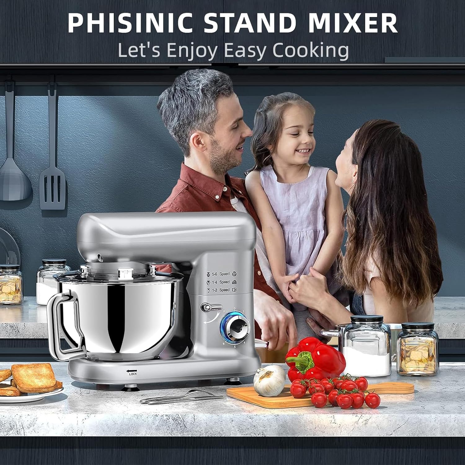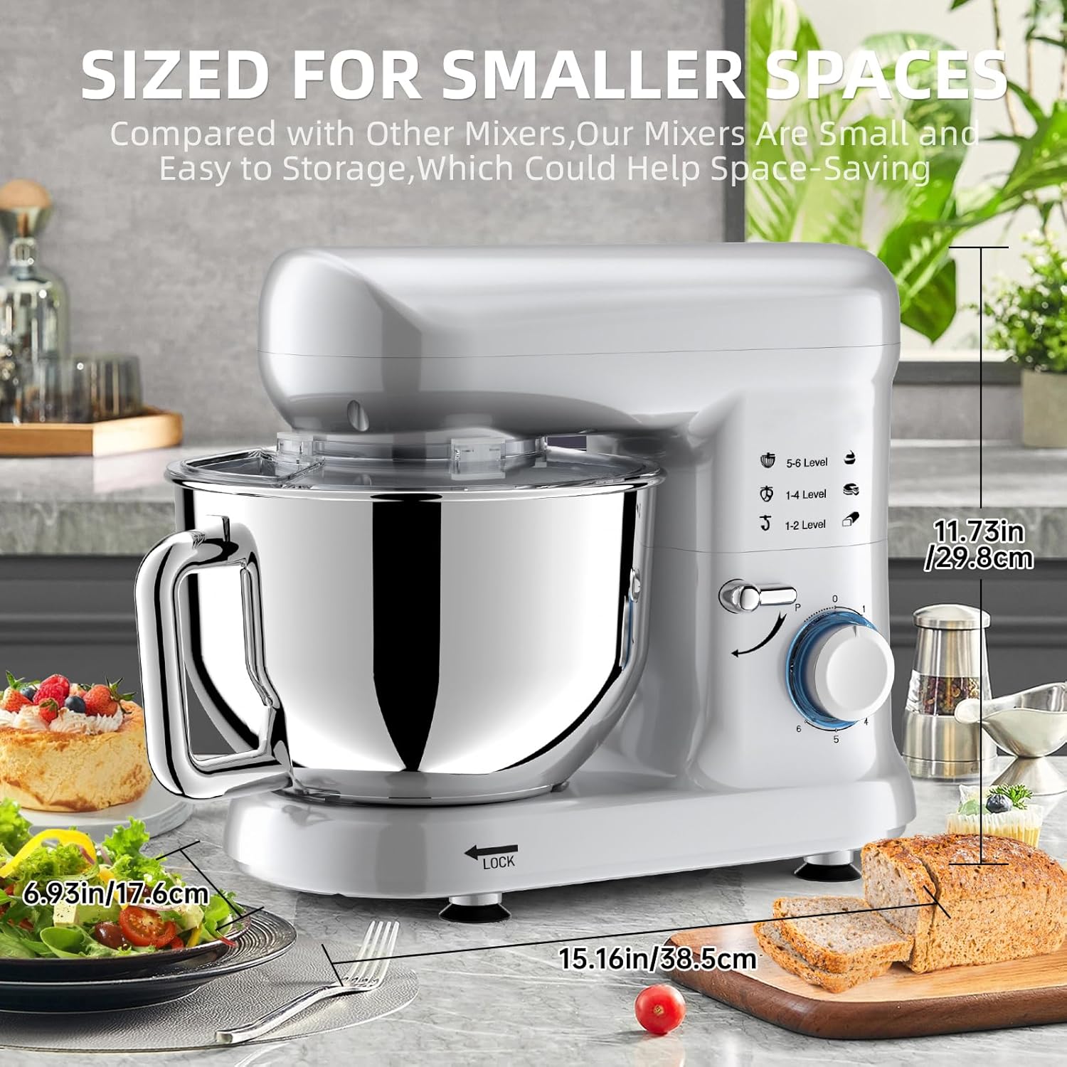 This food processor is a great helper in your kitchen. It weighs only 6 kg and has the dimensions (cm): 38.5 L x 17.6 W x 29.8 H. It can be easily stored in the cupboard and saves space Our food processor is available in two classic colours and meets different aesthetic requirements. As an everyday machine, it is easy to use and clean. Press the button to turn off the tilt head when the mixer is running - for more safety. The transparent splash guard lid prevents ingredients from mixing. This mini food processor offers 6+1 speed settings for mixing bread dough, firm dough, meringue and whipped cream as well as lower speeds for mixing and finishing finer mixtures. It is perfect for a variety of ingredients. The frame is equipped with 5 sturdy suction cups that ensure a stable stand and prevent slipping or wobbling during operation. Especially important is that our electric mixer has improved accessories: A seal on the top connector prevents food leftovers from entering the connector, making cleaning easier. Ideal gift: Our blender is ideal as a gift for Christmas, Valentine's Day, Mother's Day, New Year's Eve and holidays.