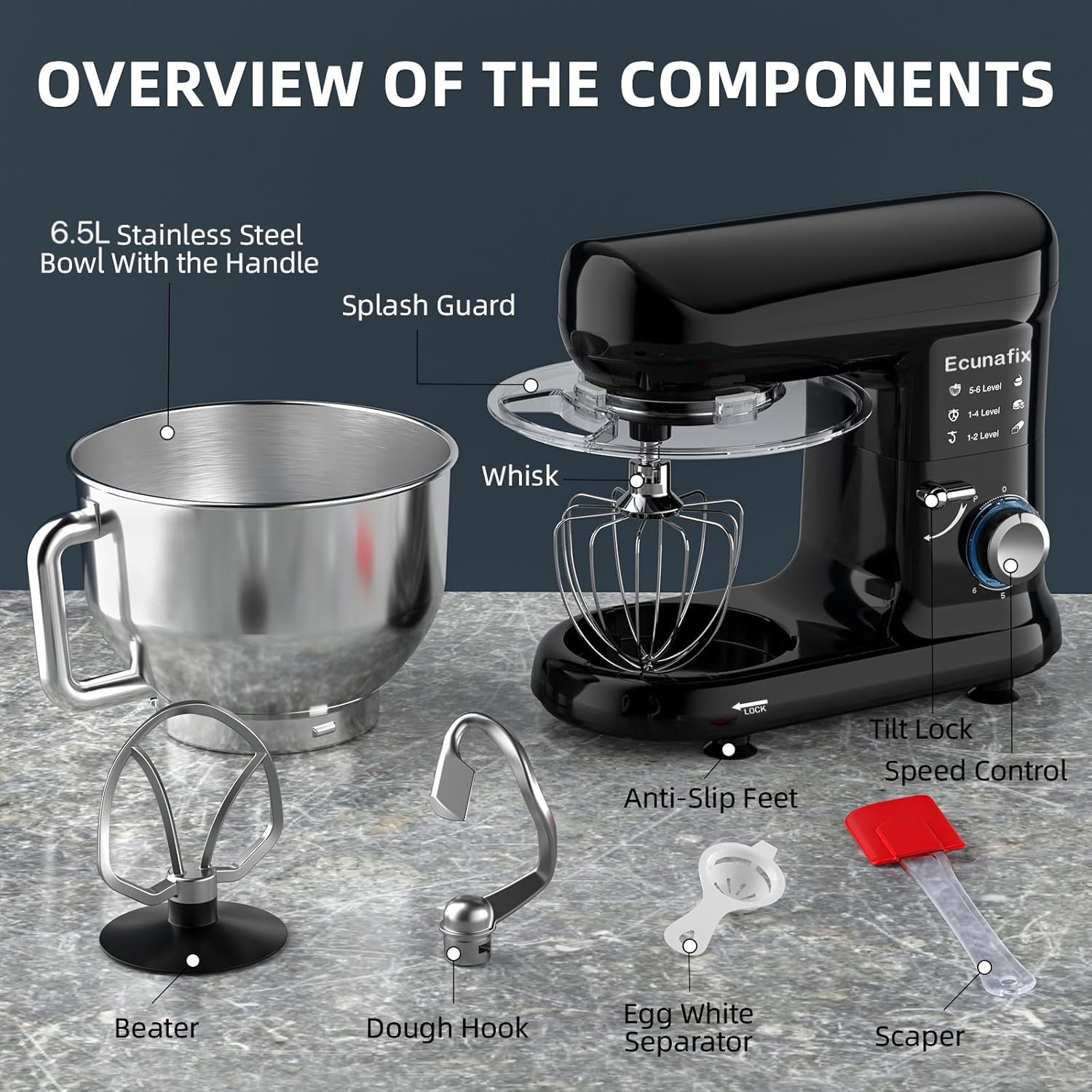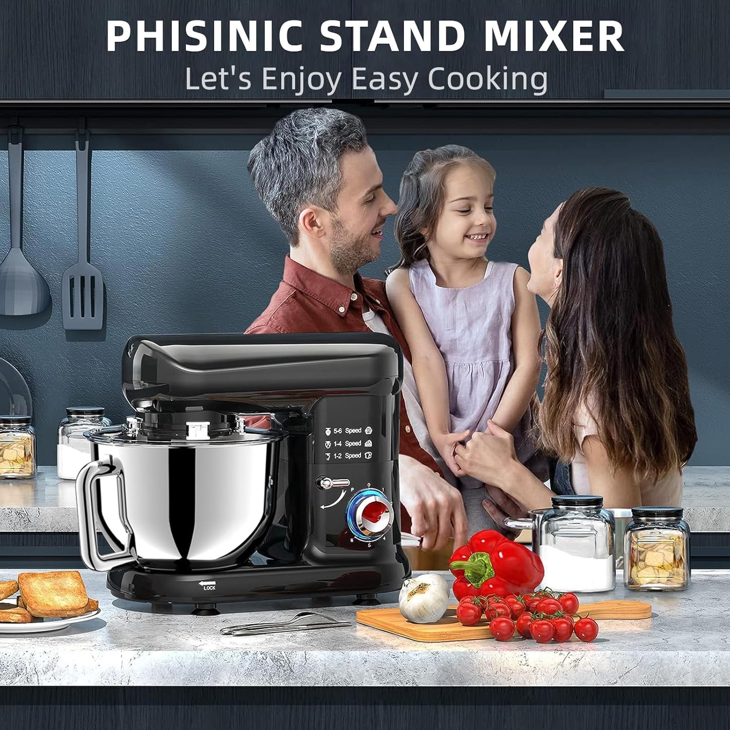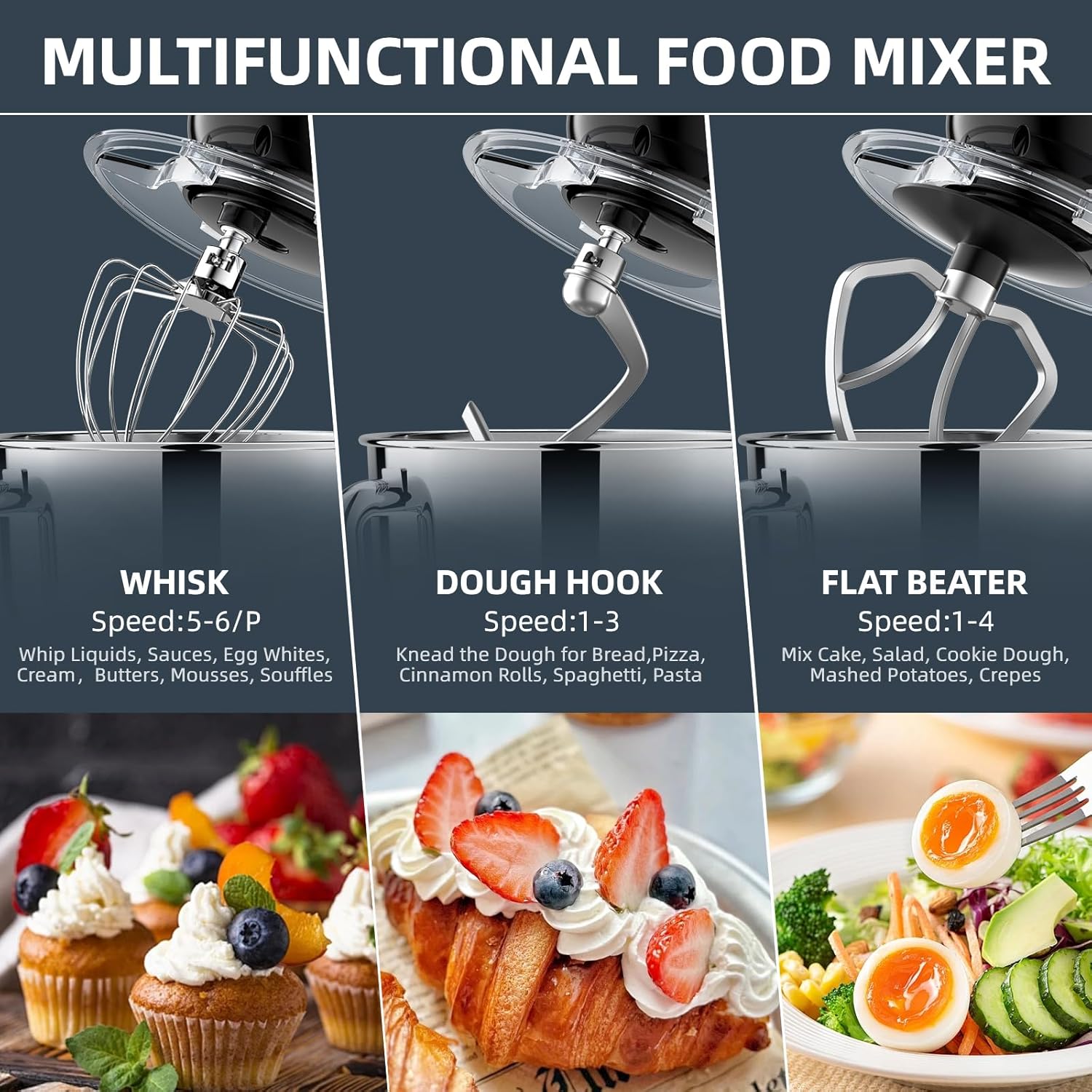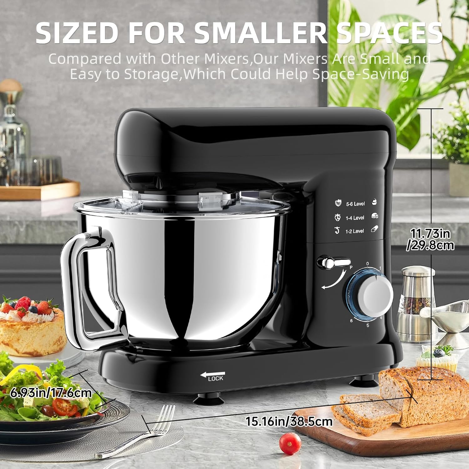 This food processor is a great helper in your kitchen. It weighs only 6 kg and has the dimensions (cm): 38.5 L x 17.6 W x 29.8 H. It can be easily stored in the cupboard and saves space Our food processor is available in two classic colours and meets different aesthetic requirements. As an everyday machine, it is easy to use and clean. Press the button to turn off the tilt head when the mixer is running - for more safety. The transparent splash guard lid prevents ingredients from mixing. This mini food processor offers 6+1 speed settings for mixing bread dough, firm dough, meringue and whipped cream as well as lower speeds for mixing and finishing finer mixtures. It is perfect for a variety of ingredients. The frame is equipped with 5 sturdy suction cups that ensure a stable stand and prevent slipping or wobbling during operation. Especially important is that our electric mixer has improved accessories: A seal on the top connector prevents food leftovers from entering the connector, making cleaning easier. Ideal gift: Our blender is ideal as a gift for Christmas, Valentine's Day, Mother's Day, New Year's Eve and holidays.
