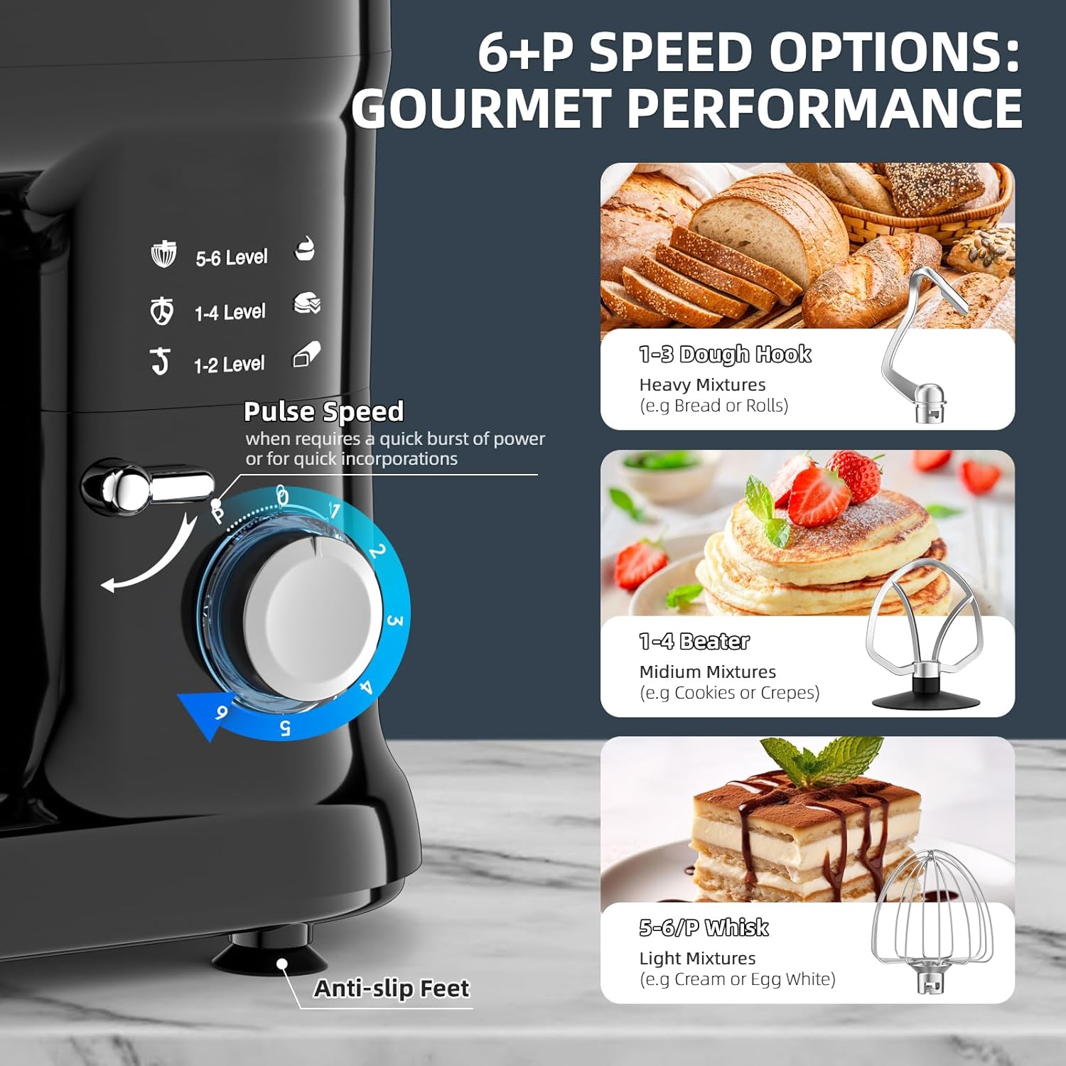 With the precise 10-speed control, you can choose between slow and fast mixing. In addition, there is a pulse level for fast mixing and the powerful performance of the planetary mixer for mixing bread dough, thick dough, meringues and whipped cream.