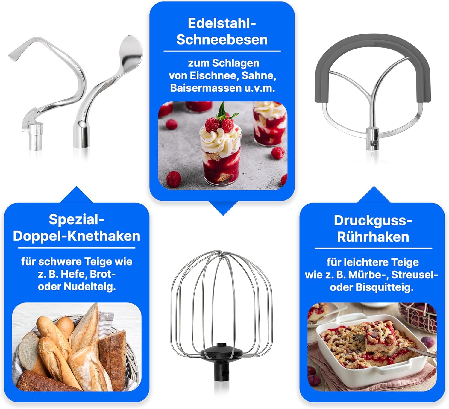 Kneten Sie zum Beispiel schwere Teige wie Hefe-, Nudel oder Brotteig mit dem Spezial-Doppelknethaken.