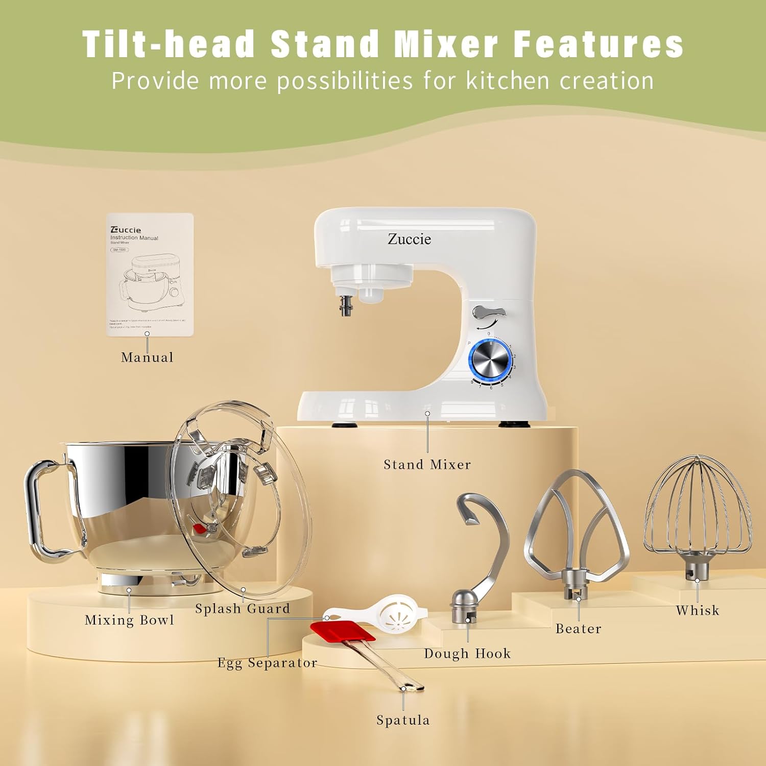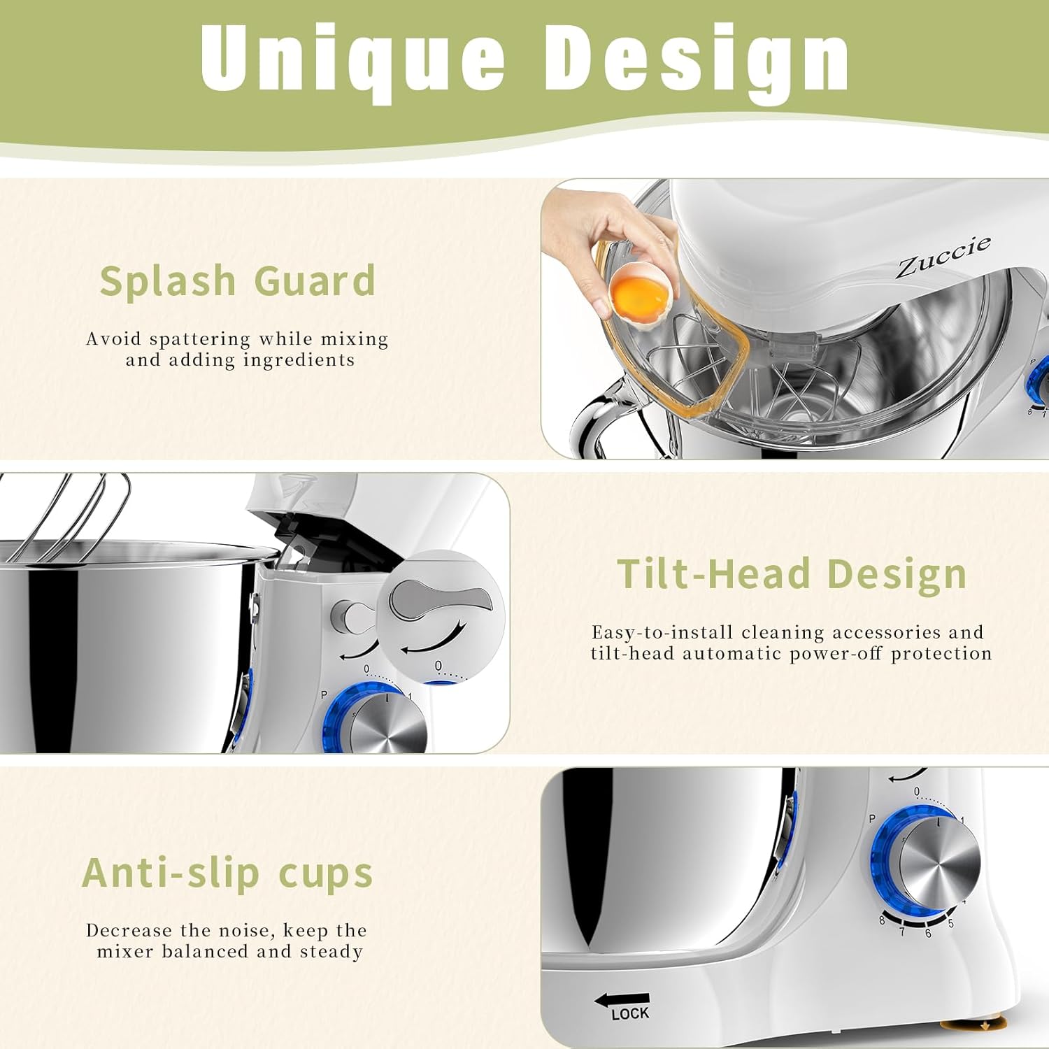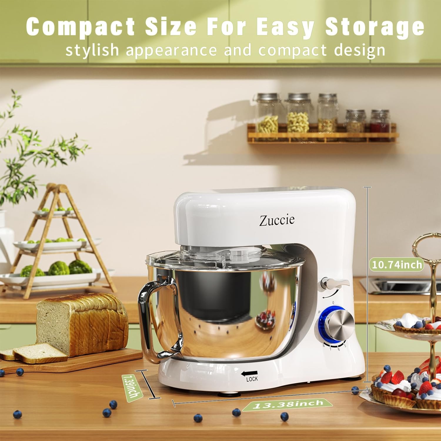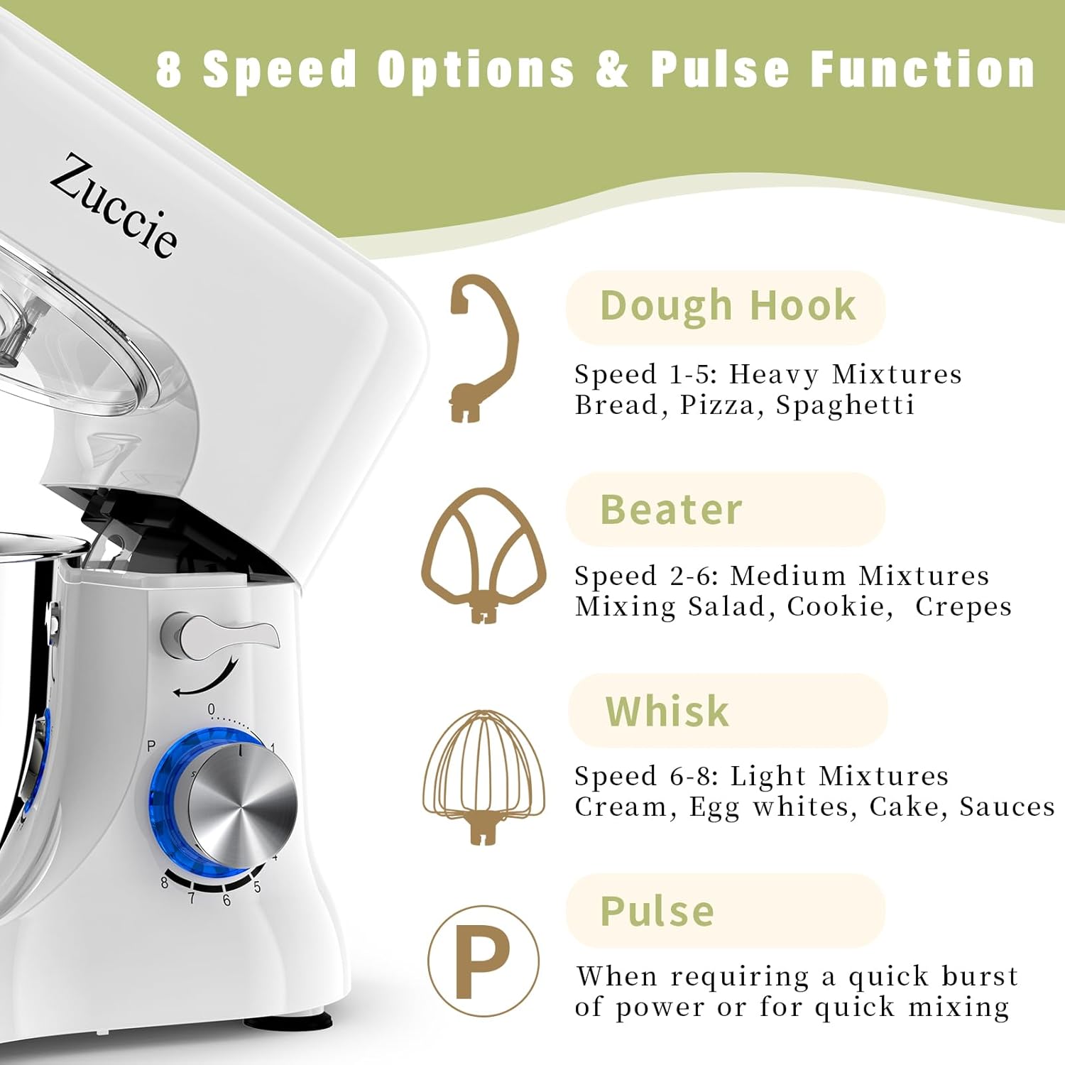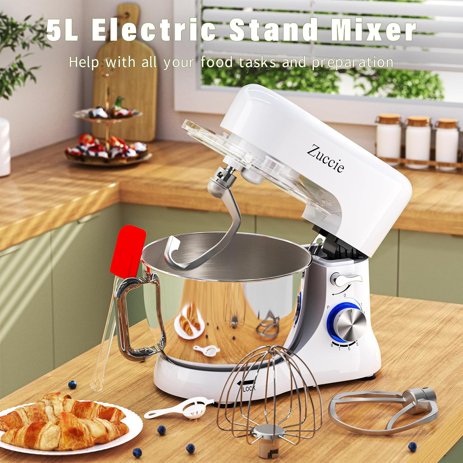 Кухненски робот Zuuccie, тиха машина за смесване, включваща 5-литрова купа от неръждаема стомана, 3 инструмента за смесване, предпазител от пръски, стъргалка за тесто и разделител за яйца, машина за бързо тесто 8+P (бял)