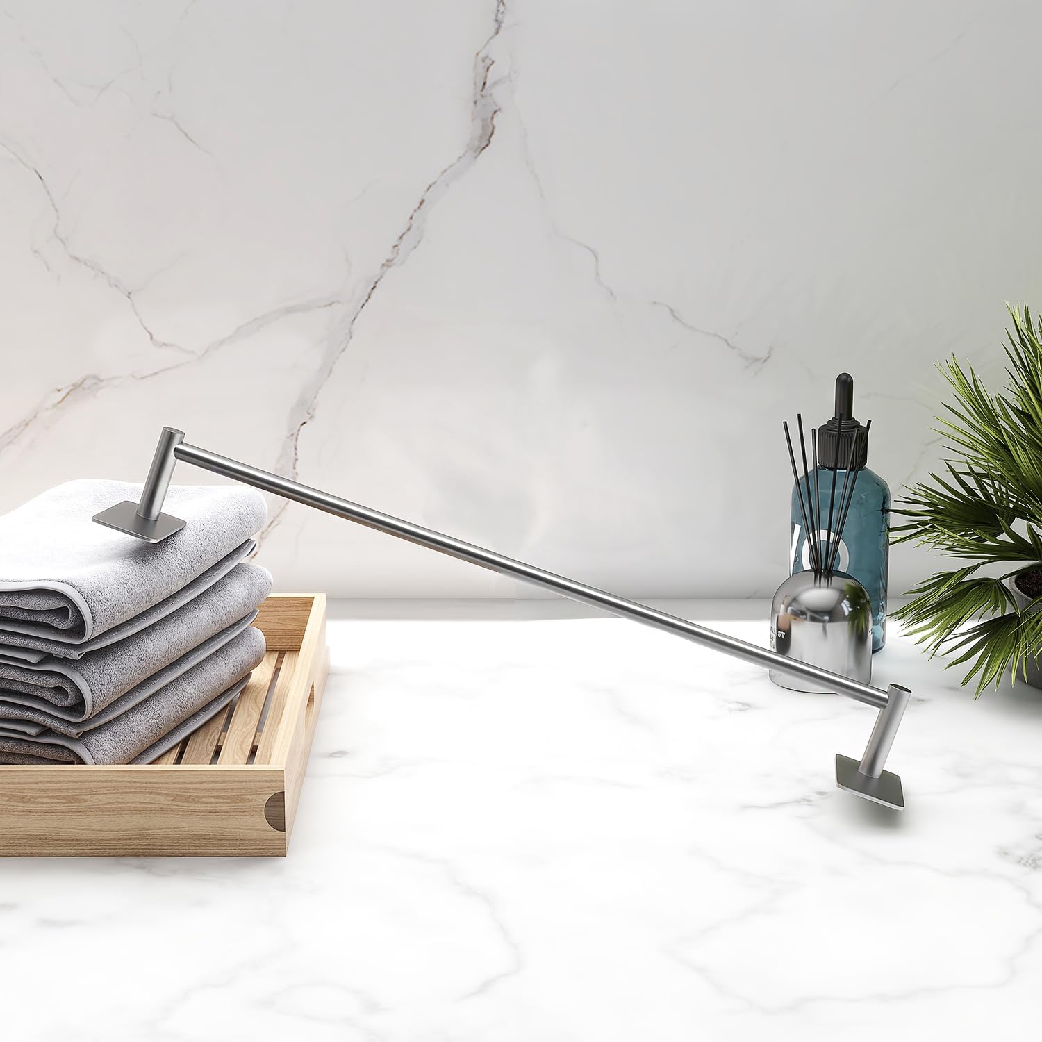 • Поставка за кърпи без пробиване: модерна поставка за кърпи, която се залепва върху гладка повърхност с малко подготовка, след което се изчаква и след 24 часа може да се опъне, сякаш е била пробита. Много е важно за плочките да бъдат старателно почистени. Без пробиване, без винтове, без дупки, без инструменти, лепило 3M вместо пробиване, без повреди по стената.