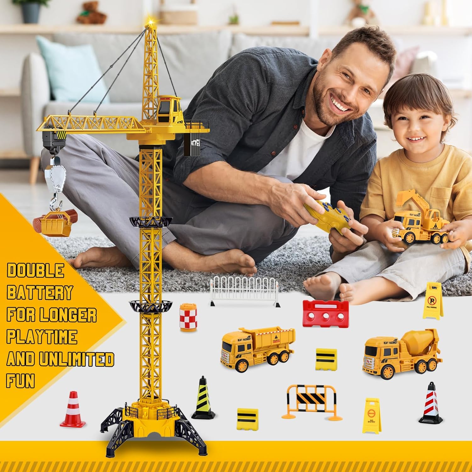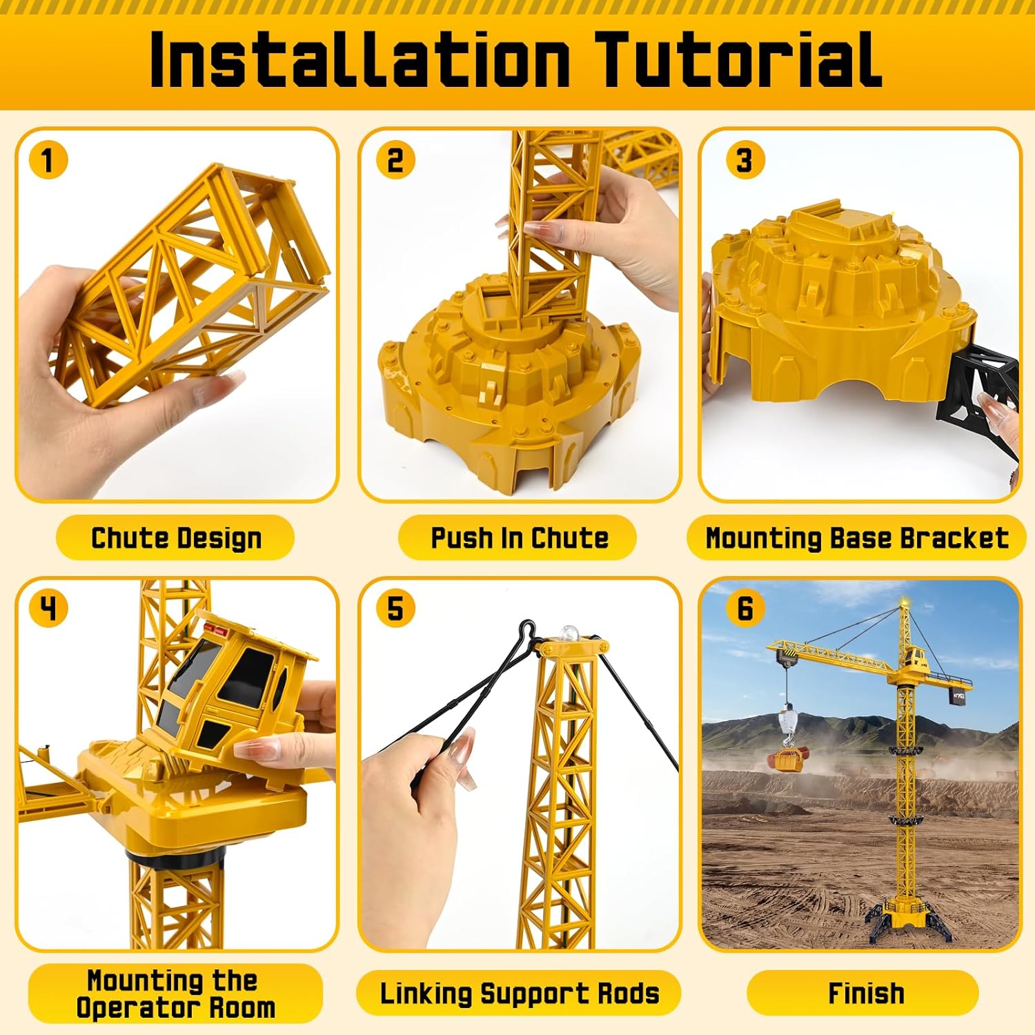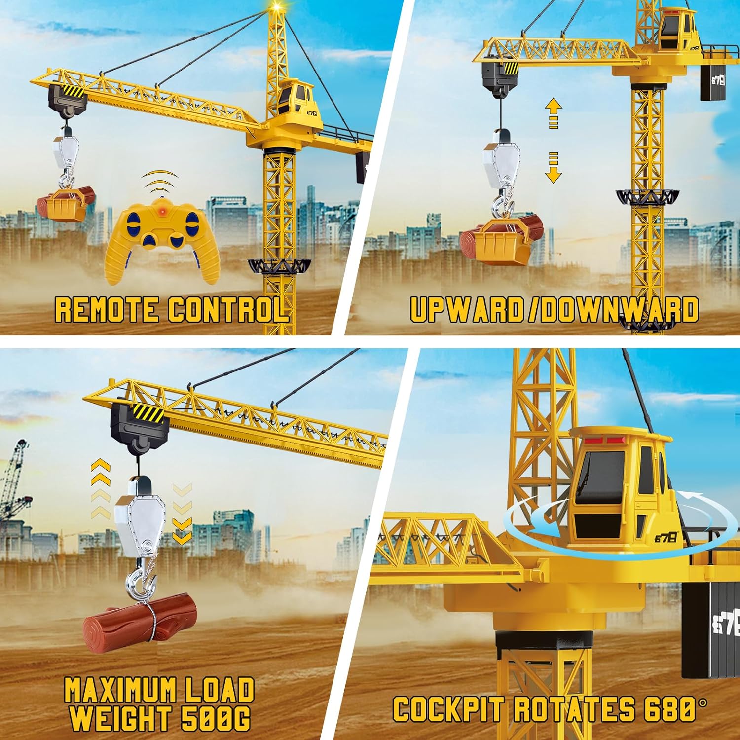 • Реалистичен дизайн: нашият дистанционно управляван RC кран е много подобен на истинските кранове, използвани в строителните проекти. Кранът има фар на върха с реалистични звукови ефекти по време на работа, можете да местите куката нагоре и надолу, да движите шейната напред и назад, кулата може да се върти до 680 градуса, кулата може да се върти плавно по часовниковата стрелка и обратно на часовниковата стрелка.