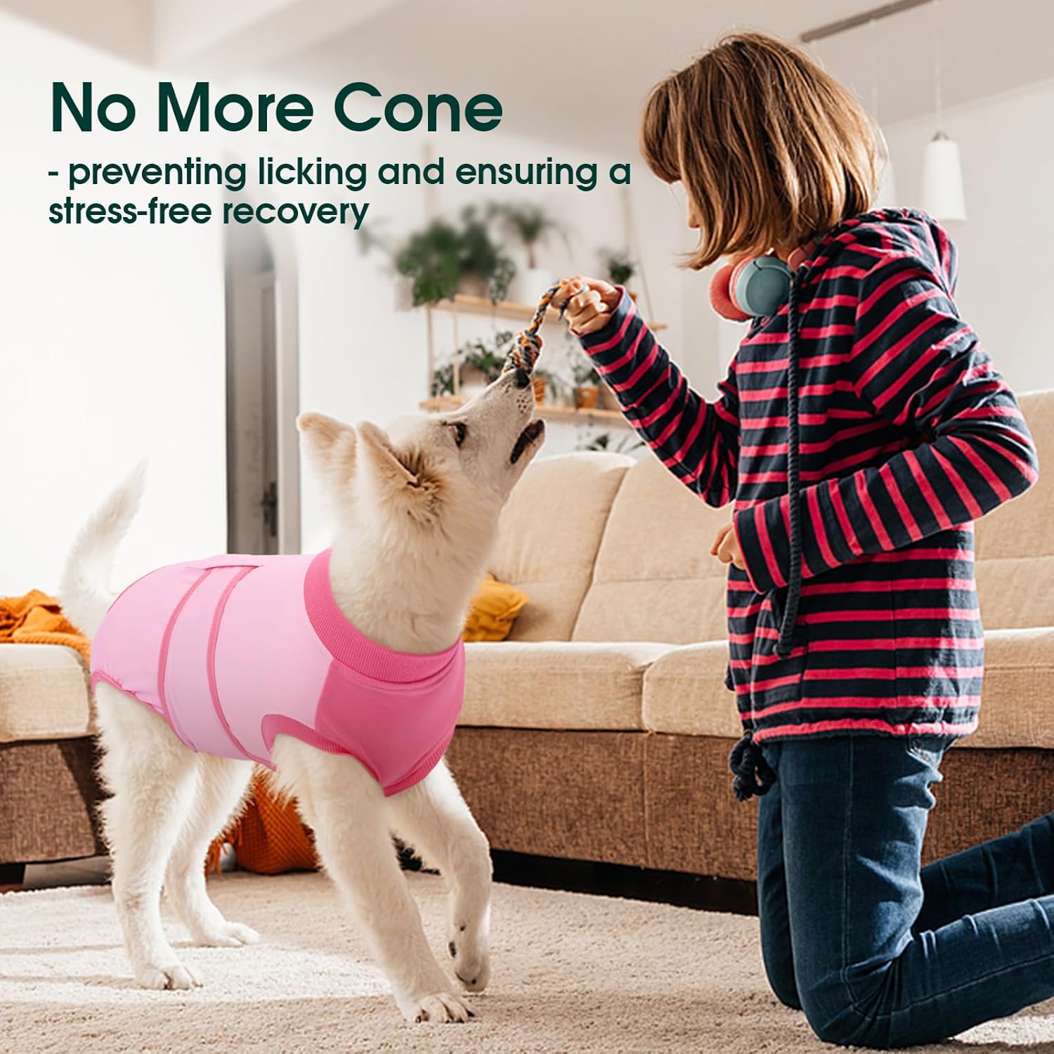 • Дишащ боди за кучета: Бодито за възстановяване на кучета е изработено от 95% памук и 5% еластан – супер меко, удобно, може да се пере и бързо съхне. Коремната област е изработена от 100% памук, за да предпази тази чувствителна зона по време на фазата на възстановяване.