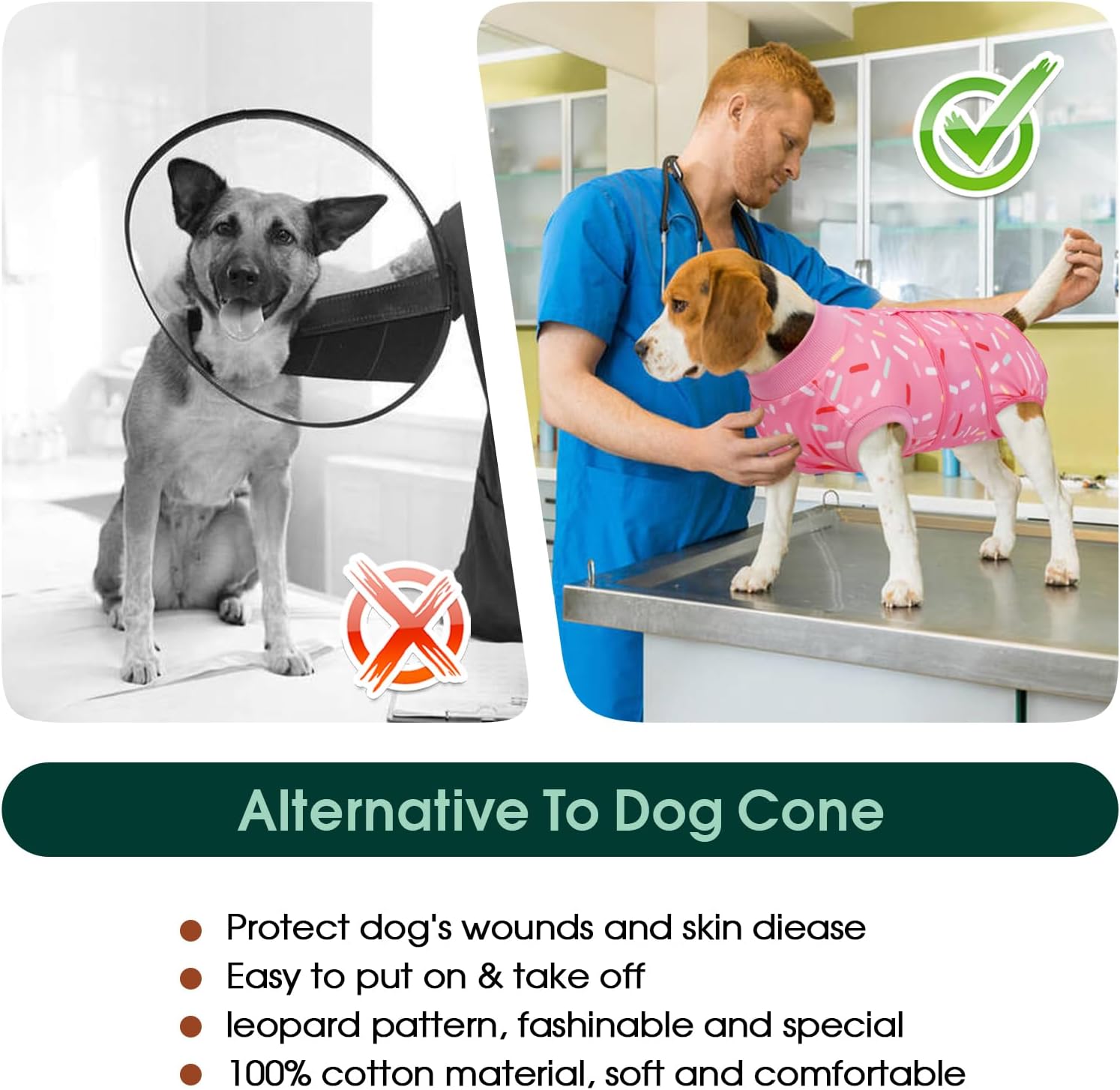 • Предотвратяване на близане и одраскване: Тези хирургически спасителни костюми за кучета са предназначени да предпазват рани, белези, разрези, превръзки, огнища на ожулвания и кожен херпес на вашия домашен любимец по време на кастрация или стерилизация, или когато се появи алергия. Носенето на този костюм увеличава мобилността на вашия домашен любимец, намалява стреса и му помага да се възстанови по-бързо.