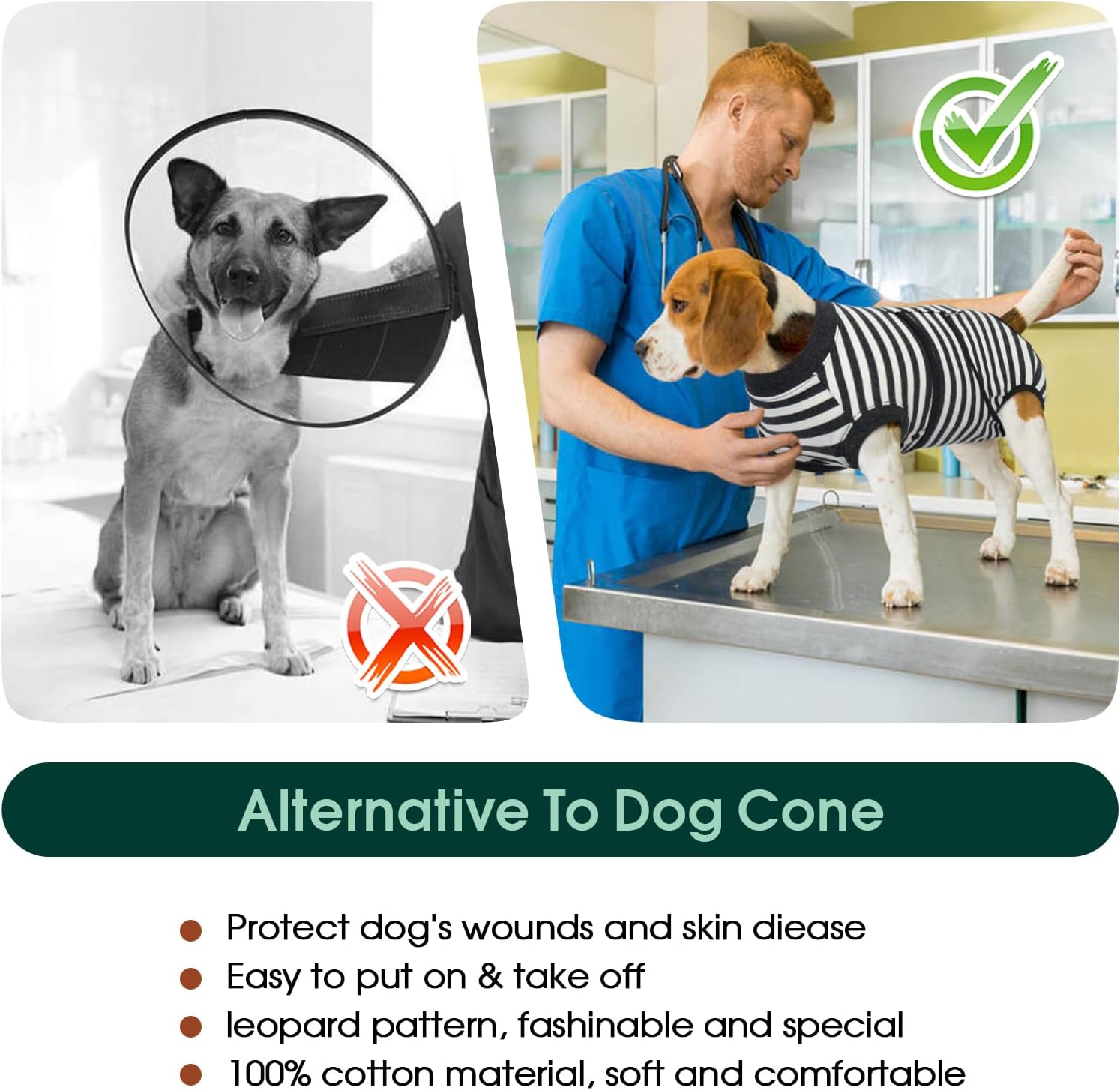 • Алтернатива на електронна каишка: Вашият домашен любимец се нуждае от комфортно възстановяване! Носенето на този хирургически костюм за мъжки и женски кучета помага за защита на засегнатата област, вместо да покрива цялата глава. Той е перфектна алтернатива на конуса за целомъдрие, позволявайки на вашия домашен любимец да играе и да се храни без ограничения.
