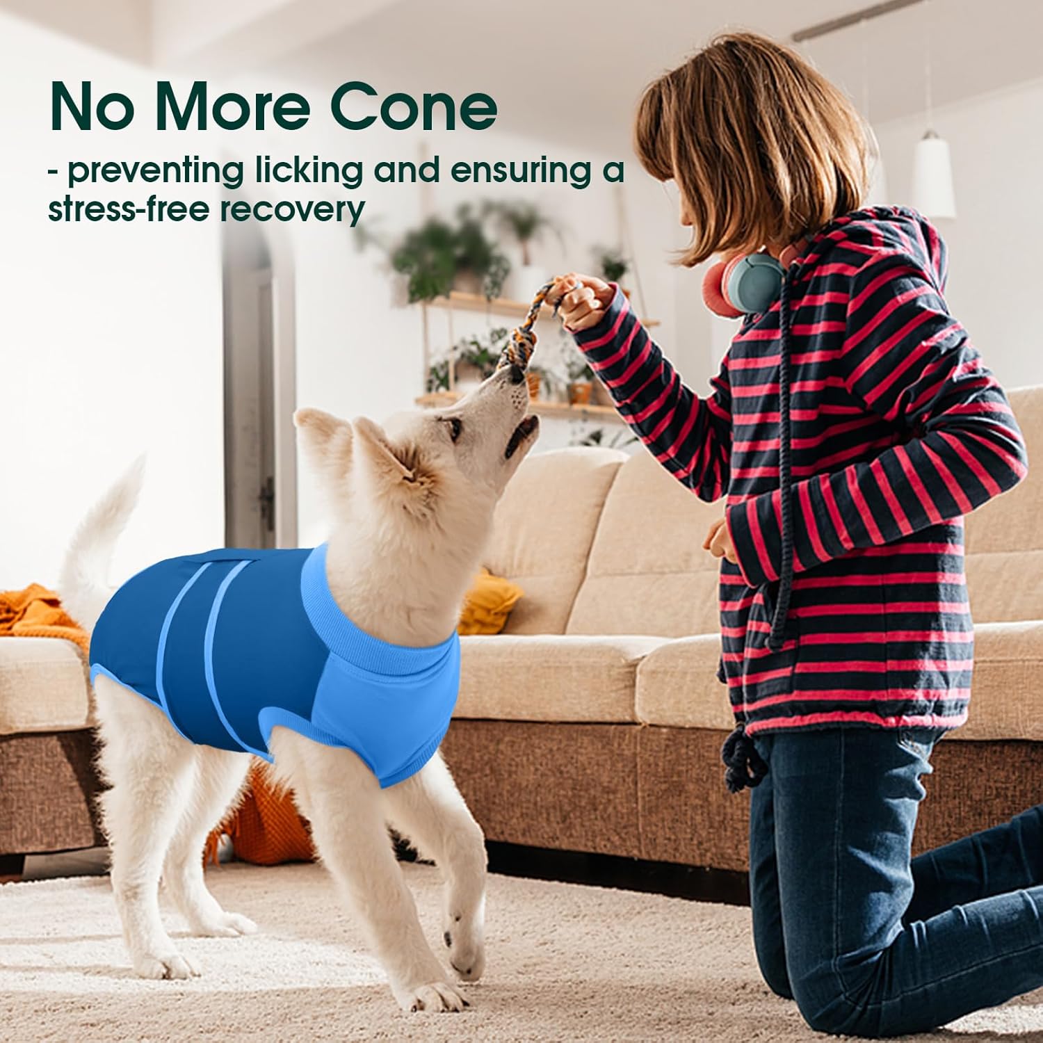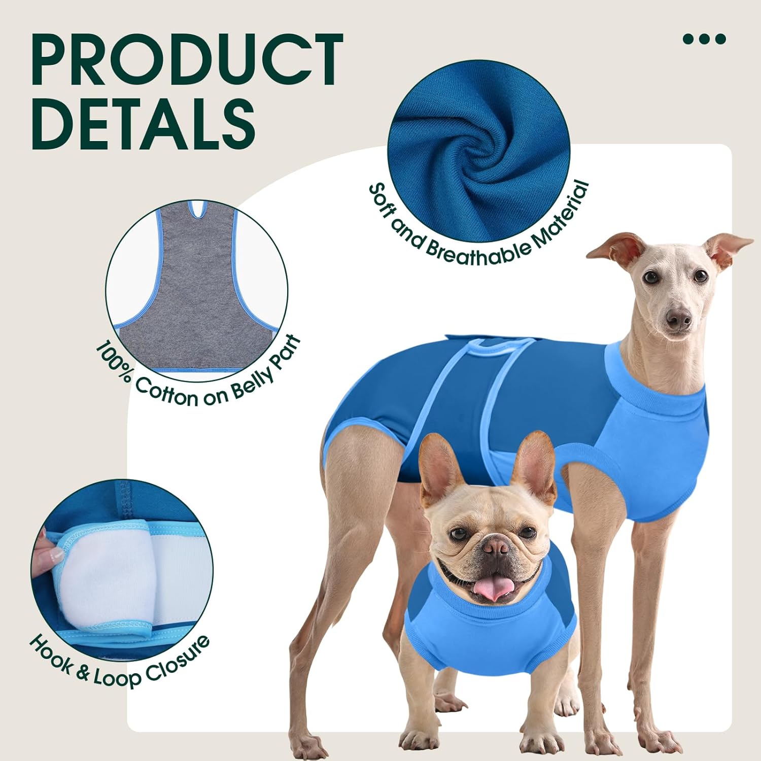 • Дишащ боди за кучета: Бодито за възстановяване на кучета е изработено от 95% памук и 5% еластан – супер меко, удобно, може да се пере и бързо съхне. Коремната област е изработена от 100% памук, за да предпази тази чувствителна зона по време на фазата на възстановяване.