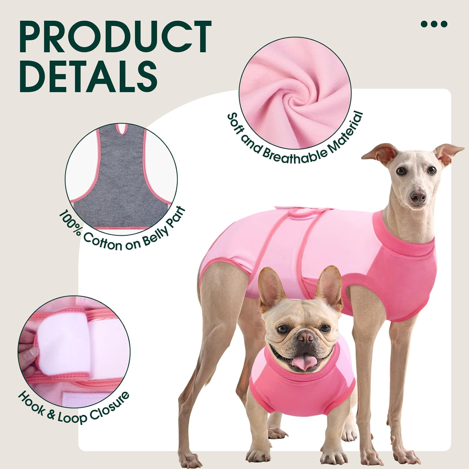 • Дишащ боди за кучета: Бодито за възстановяване на кучета е изработено от 95% памук и 5% еластан – супер меко, удобно, може да се пере и бързо съхне. Коремната област е изработена от 100% памук, за да предпази тази чувствителна зона по време на фазата на възстановяване.