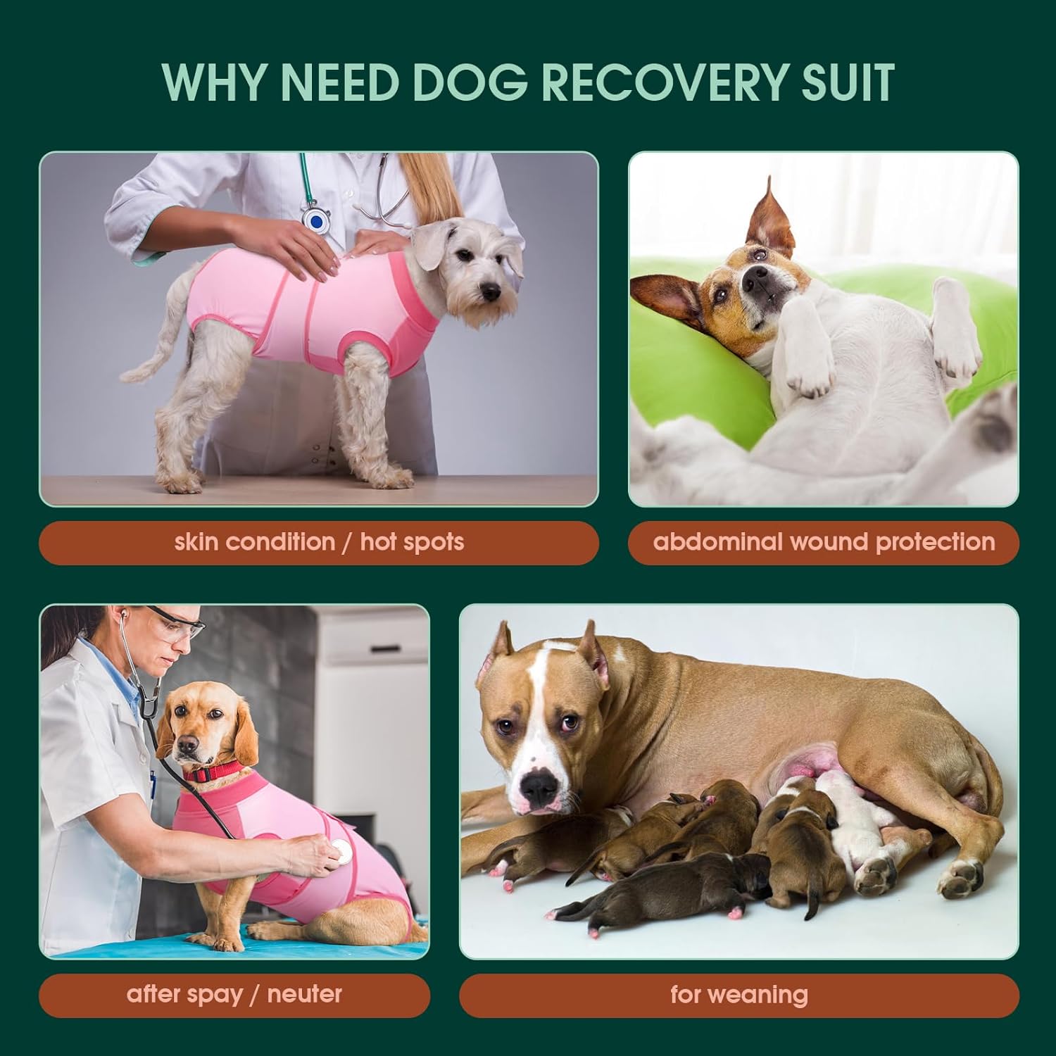 • Следоперативно боди за кучета: Това следоперативно боди за женски кучета предотвратява облизването на рани. Помага и при кожни проблеми, инфекциозни заболявания, алергии и инфекции. Жилетката за кучета може да се използва и като домашно облекло и предлага пълна свобода на движение.
