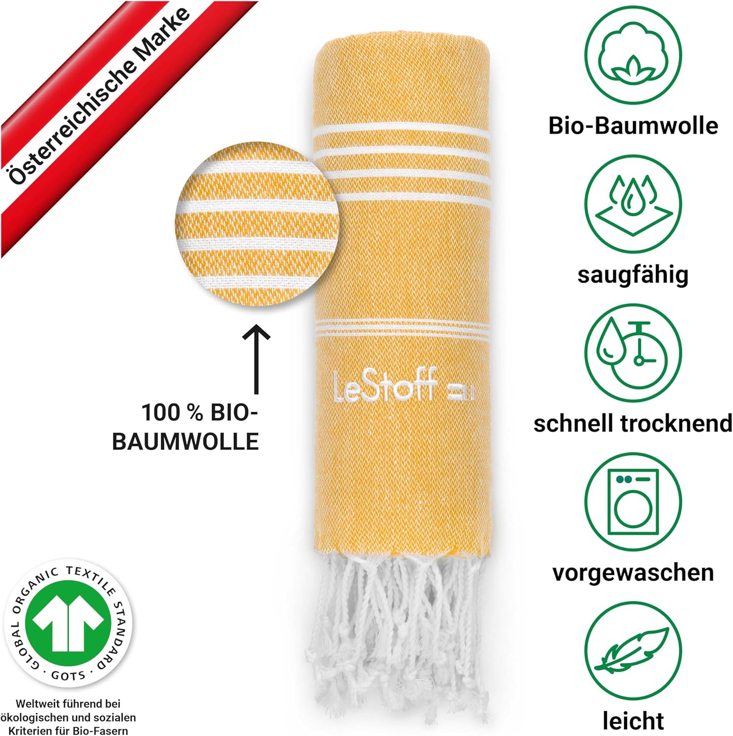 • Многофункционална: независимо дали за сушене, като плажна кърпа, кърпа за сауна, спортна кърпа, кърпа за баня или кърпа за йога – нашата хамам кърпа LeStoff впечатлява със своята многофункционалност. Идеална за пътуване, защото благодарение на лекотата си и възможността за навиване, тя е перфектната кърпа за пътуване и къмпинг.