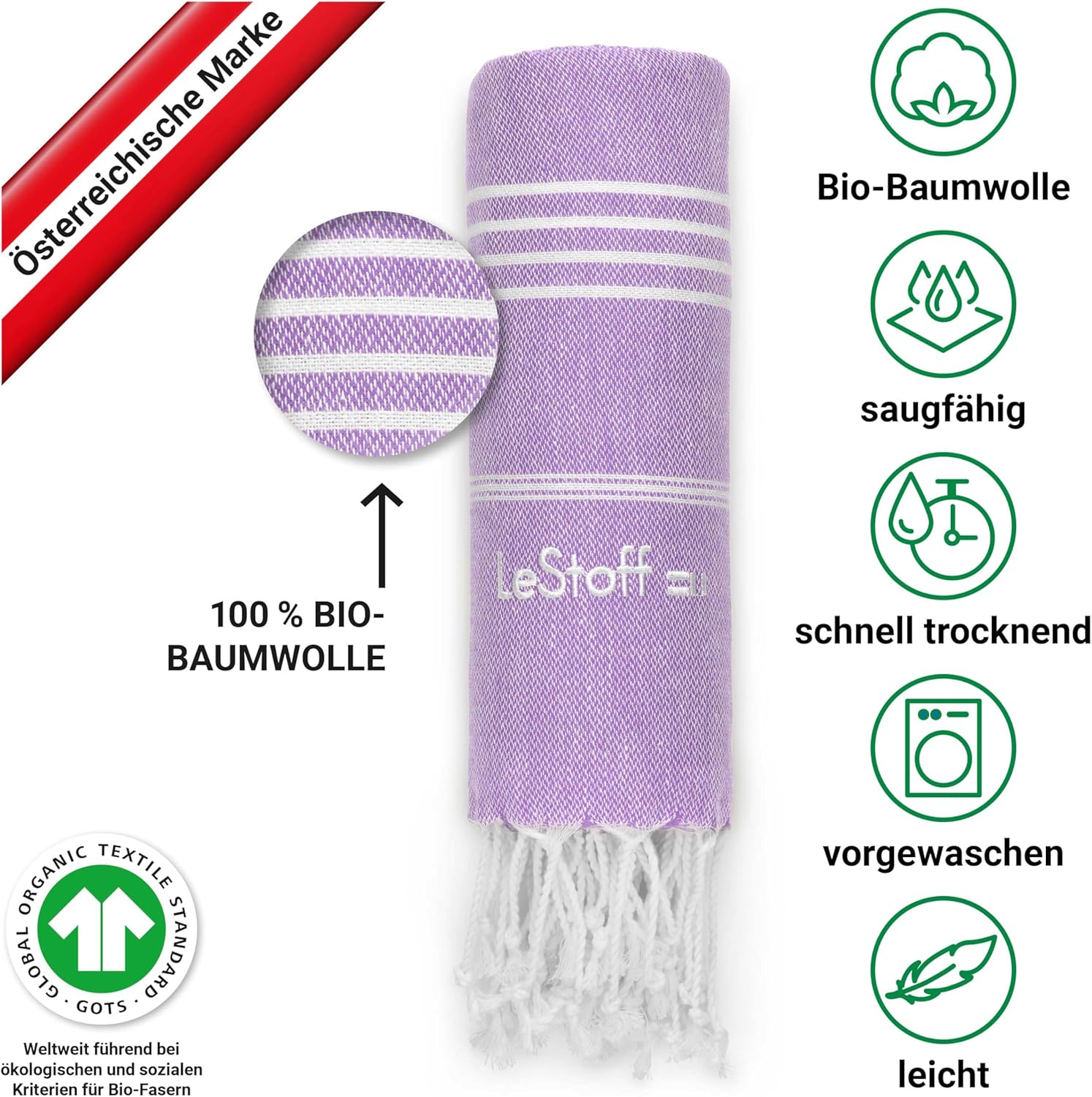 • Многофункционална: независимо дали за сушене, като плажна кърпа, кърпа за сауна, спортна кърпа, кърпа за баня или кърпа за йога – нашата хамам кърпа LeStoff впечатлява със своята многофункционалност. Идеална за пътуване, защото благодарение на лекотата си и възможността за навиване, тя е перфектната кърпа за пътуване и къмпинг.