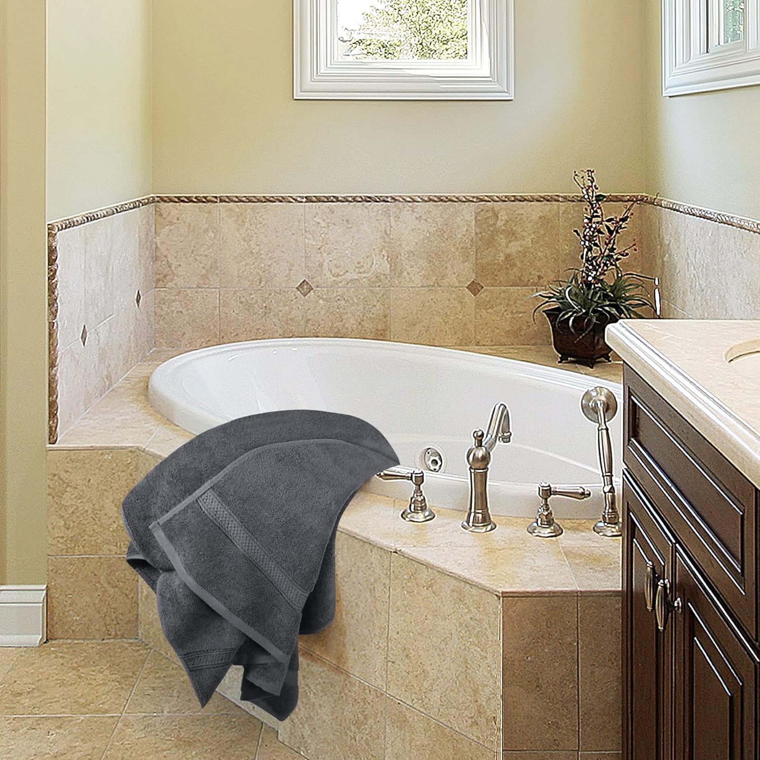 Поглезете се със 100% памучна хавлиена кърпа, изработена от мек и издръжлив хавлиен плат с пръстеновидно предене. Всяка кърпа за баня осигурява оптимално покритие, абсорбция и гъвкавост. Използвайте я на плажа или басейна като аксесоар за почивка или се поглезете с кърпи със спа качество у дома. Голямата кърпа за баня с размери 69 x 137 см е изключително абсорбираща и практична за бързо съхнене, достатъчно покритие или удобно лежане. Професионално подгънатите краища са внимателно обработени, за да се подобри качеството и издръжливостта на кърпата. Кърпите са силно абсорбиращи и остават меки дори след няколко цикъла на пране и сушене.