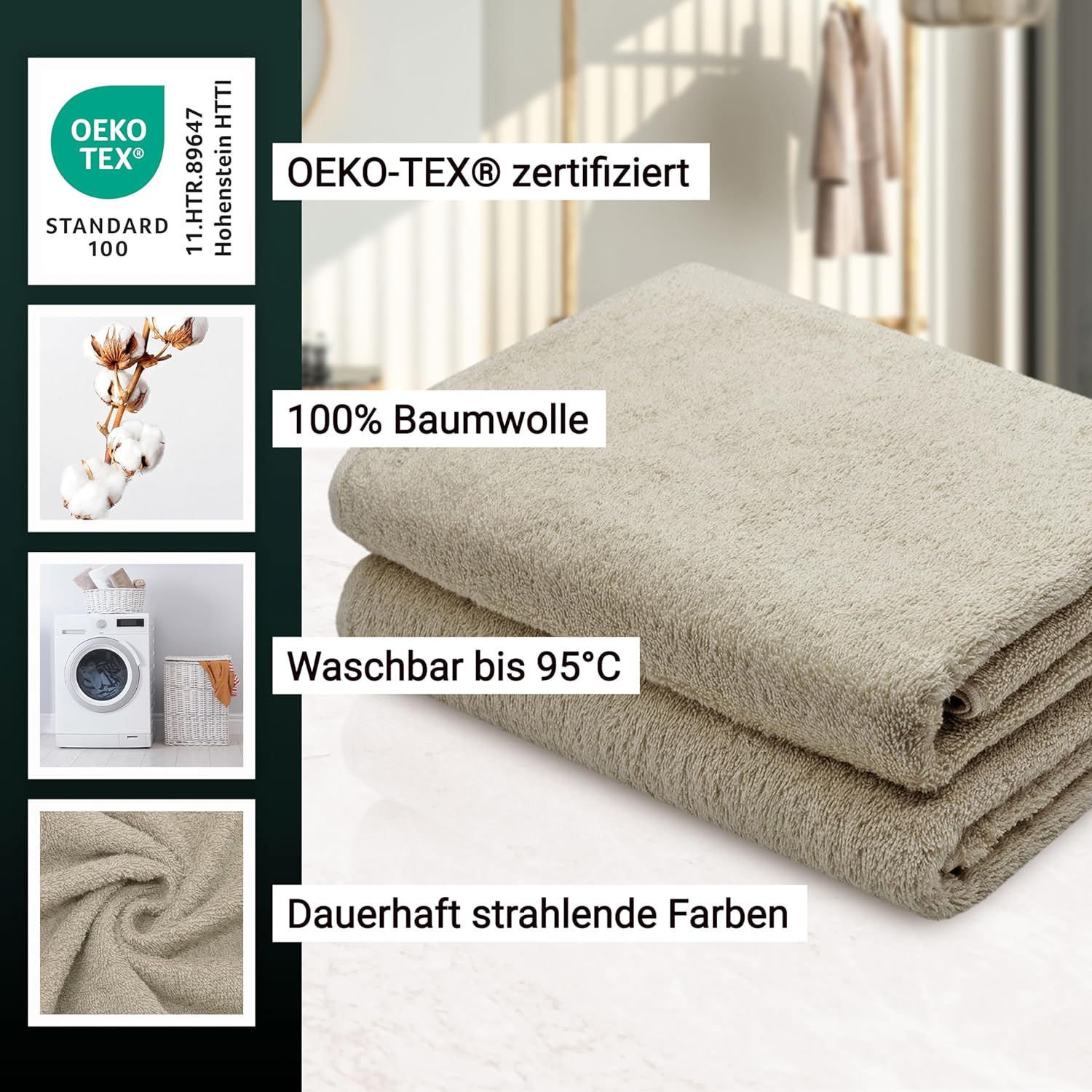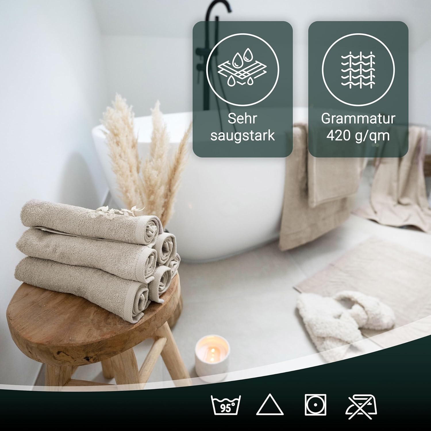 Абсорбиращите постелки за баня впечатляват с най-високата си устойчивост на цветовете. Благодарение на боядисването с индантрен, хавлиените кърпи постигат най-високи стойности за устойчивост на цветовете и най-добра стабилност на цветовете, могат да се перат до 95°C и дори са устойчиви на кипене и хлор.