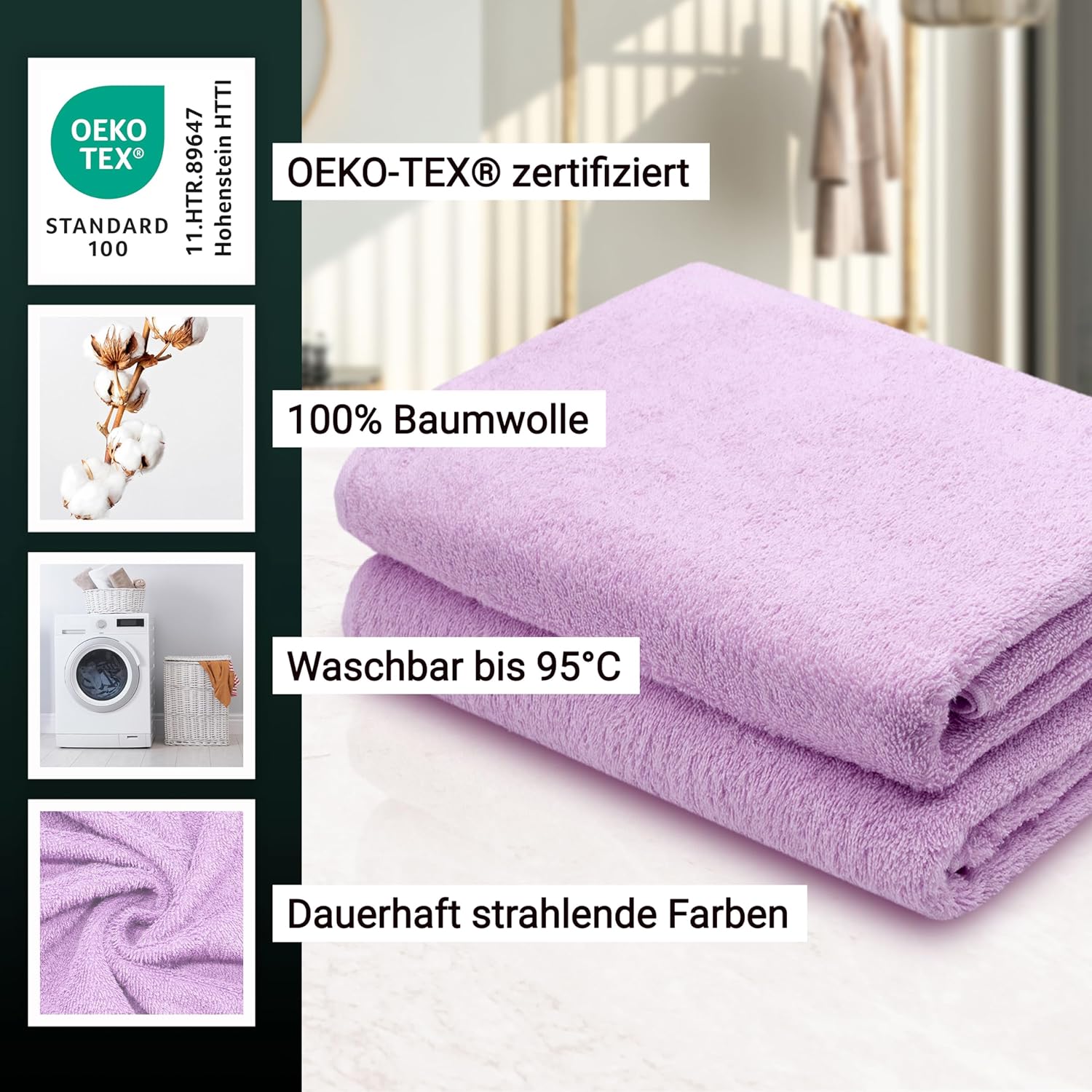 Абсорбиращите постелки за баня впечатляват с най-високата си устойчивост на цветовете. Благодарение на боядисването с индантрен, хавлиените кърпи постигат най-високи стойности за устойчивост на цветовете и най-добра стабилност на цветовете, могат да се перат до 95°C и дори са устойчиви на кипене и хлор.