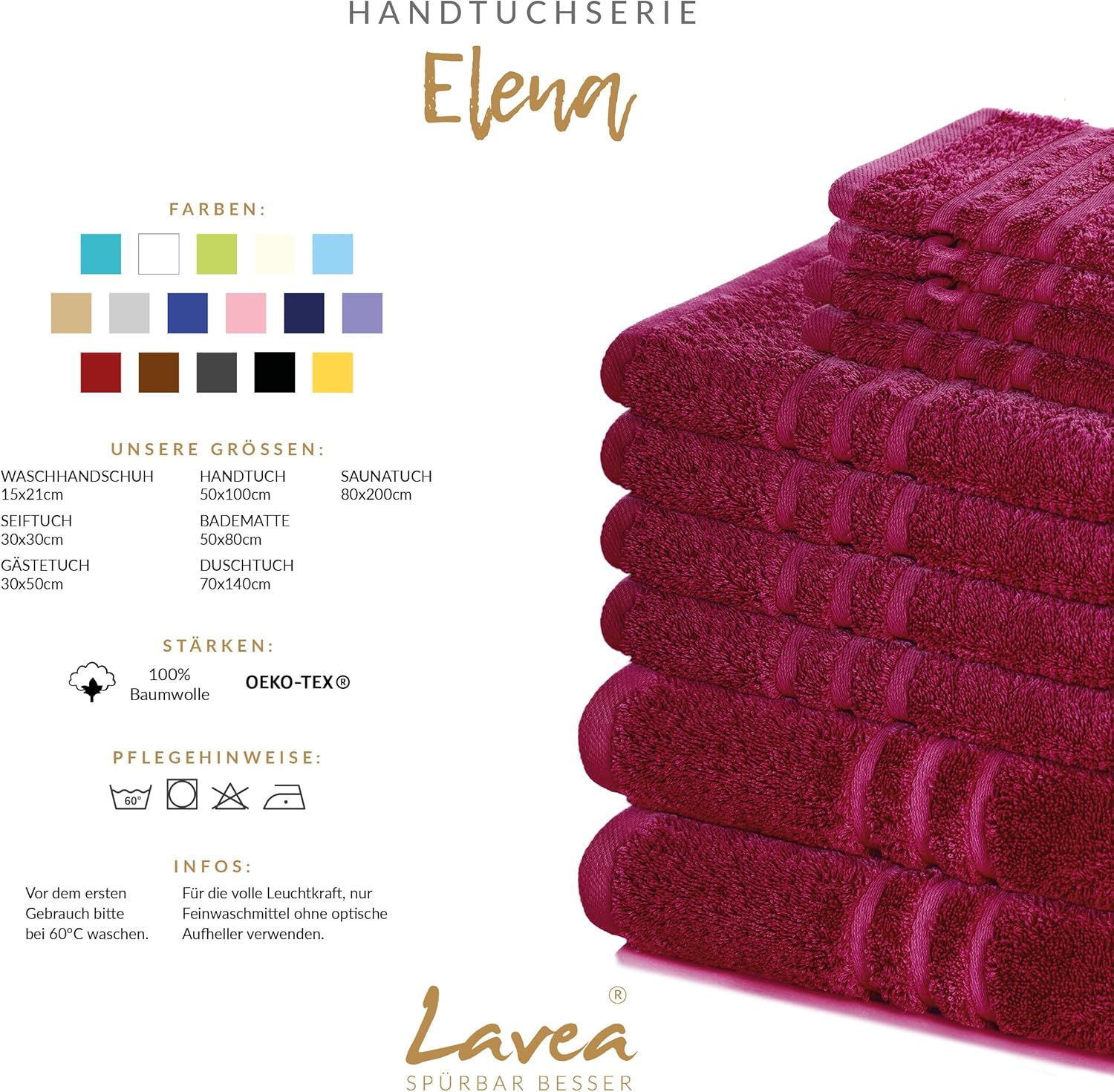 • Хавлиените кърпи са изработени от 100% памук. Абсорбиращи и издръжливи: Могат да се перет на 60°C и да се сушат в сушилня.