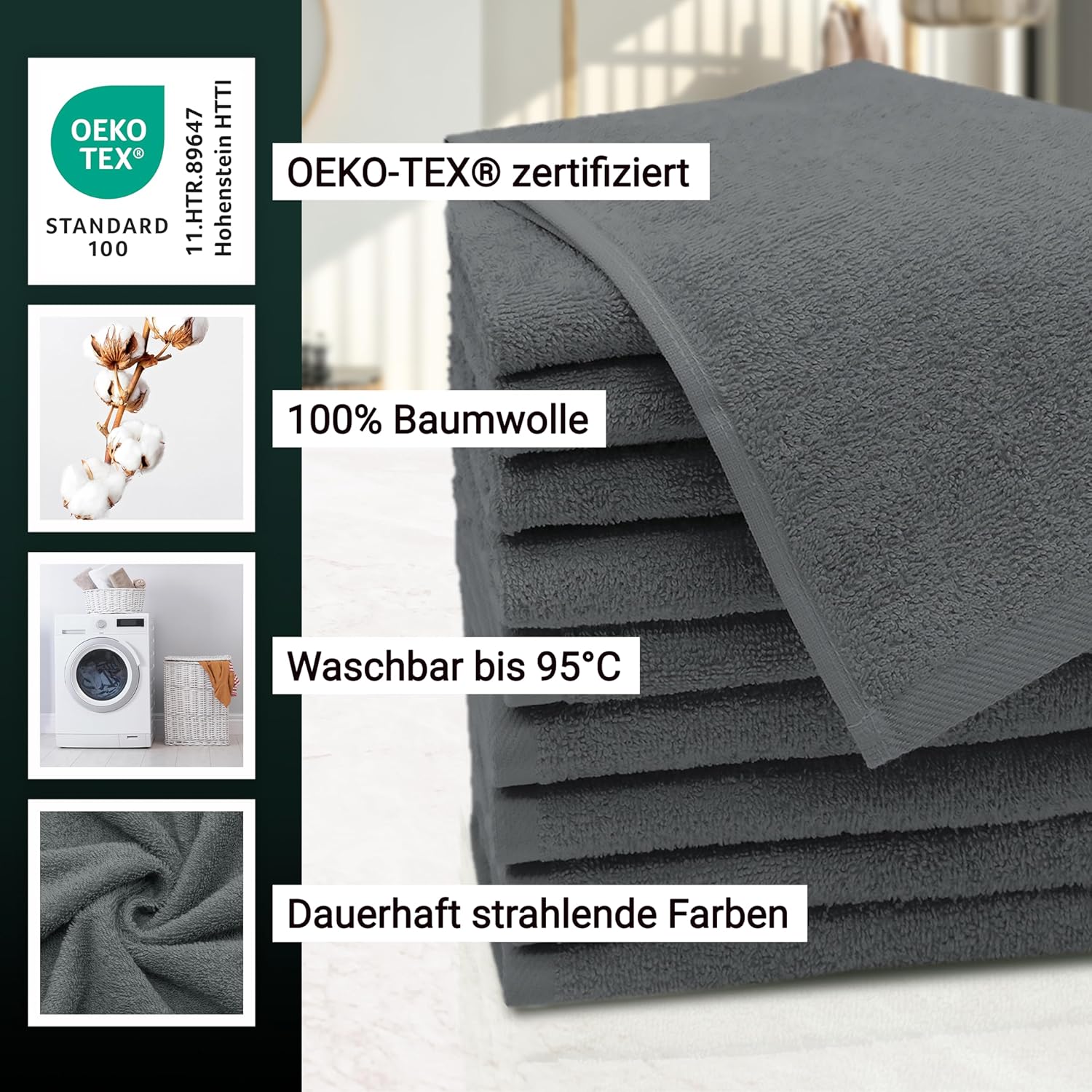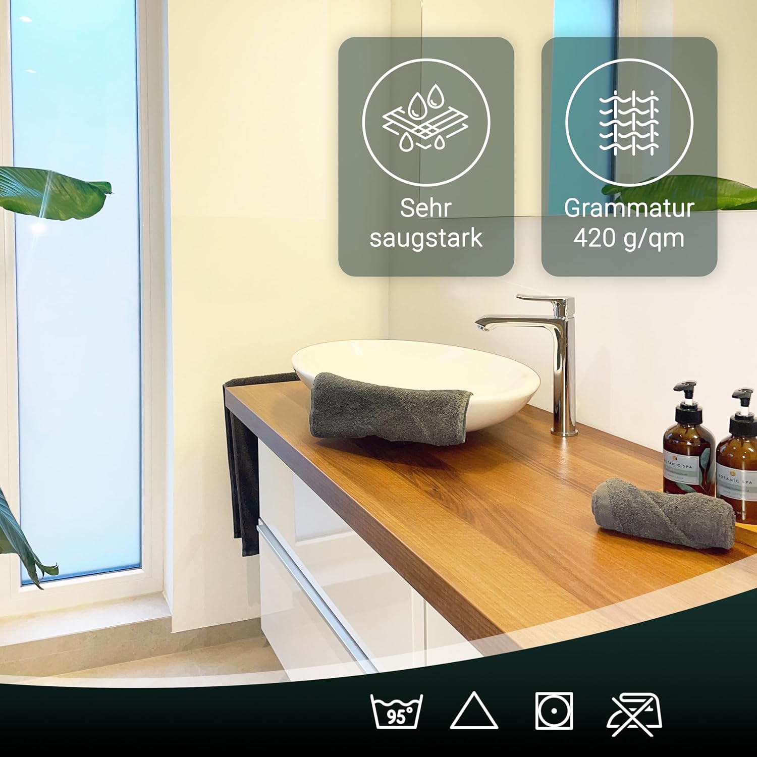 Абсорбиращите постелки за баня впечатляват с най-високата си устойчивост на цветовете. Благодарение на боядисването с индантрен, хавлиените кърпи постигат най-високи стойности за устойчивост на цветовете и най-добра стабилност на цветовете, могат да се перат до 95°C и дори са устойчиви на кипене и хлор.