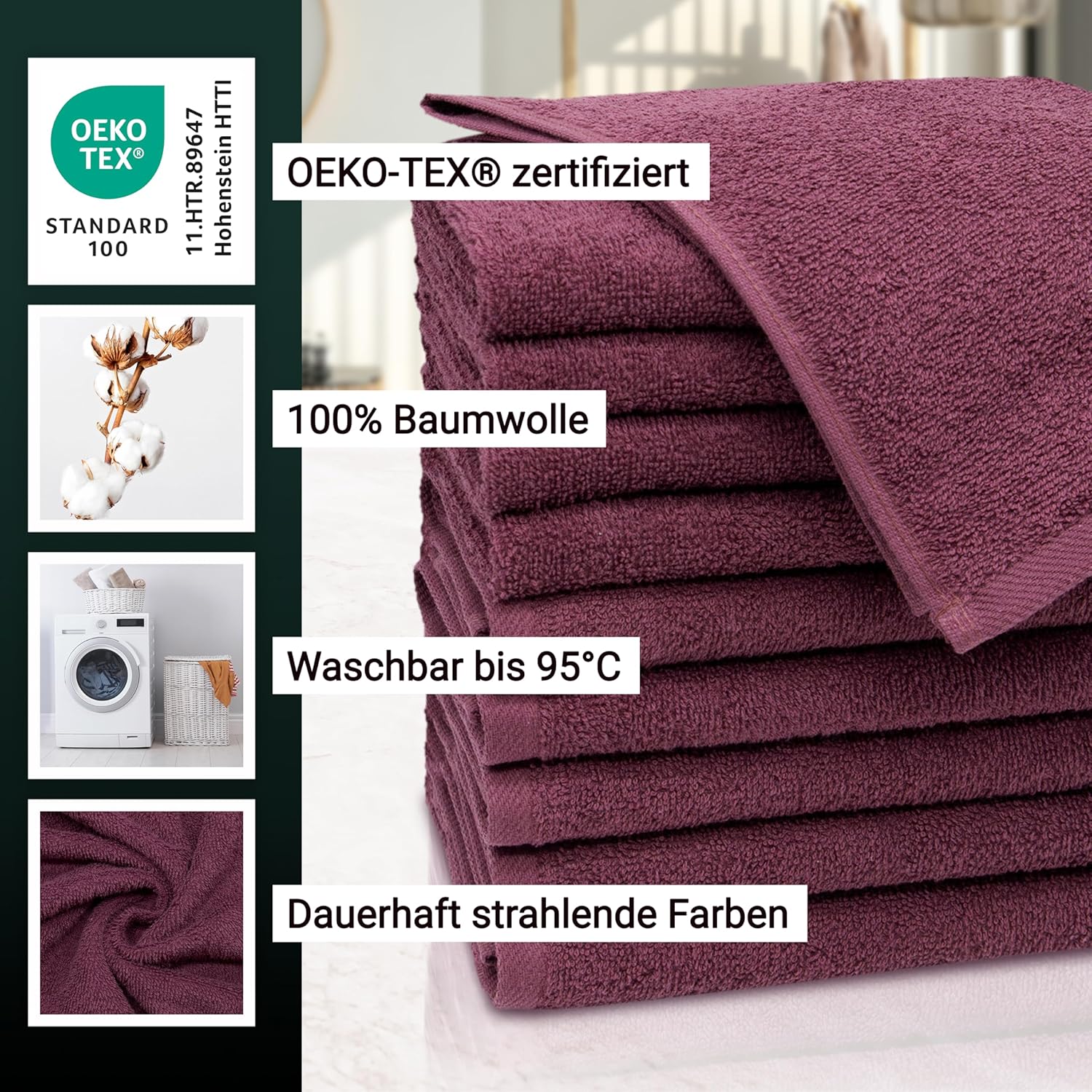 Индантреновият цвят гарантира на кърпите за гости най-високи стойности за устойчивост на цветовете и най-добра стабилност на цветовете, те могат да се перат до 95°C и дори са устойчиви на варене и хлор.
