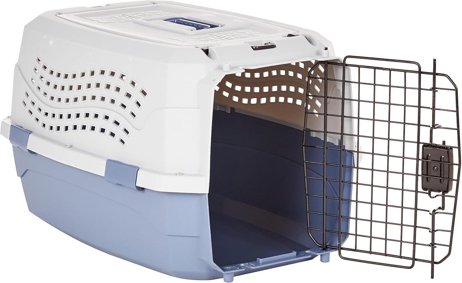 Клетката за пътуване AmazonBasics с 2 врати е изработена от издръжлива пластмаса със стоманена телена предна врата, осигуряваща здравина, безопасност и видимост, както и отлични вентилационни отвори отстрани, отгоре и отзад.