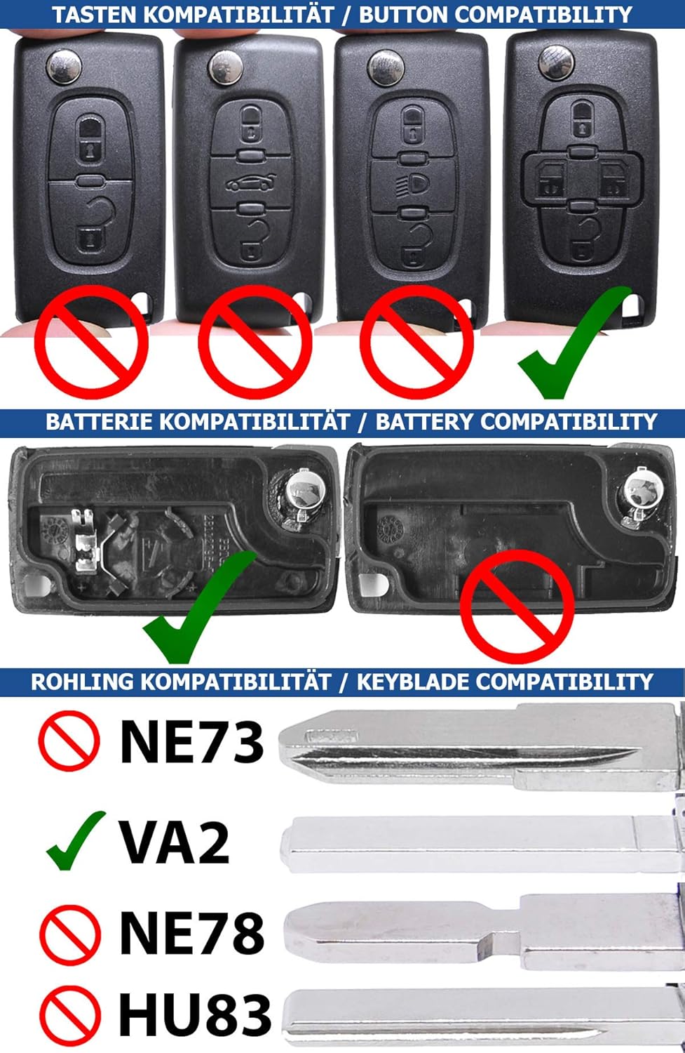 ATTENTION!! Please note the second picture and make sure all characteristics (Buttons, Battery and Key Blank) apply to your Fob!!