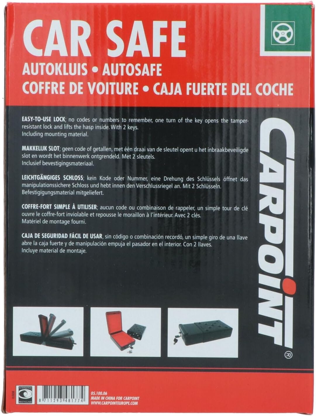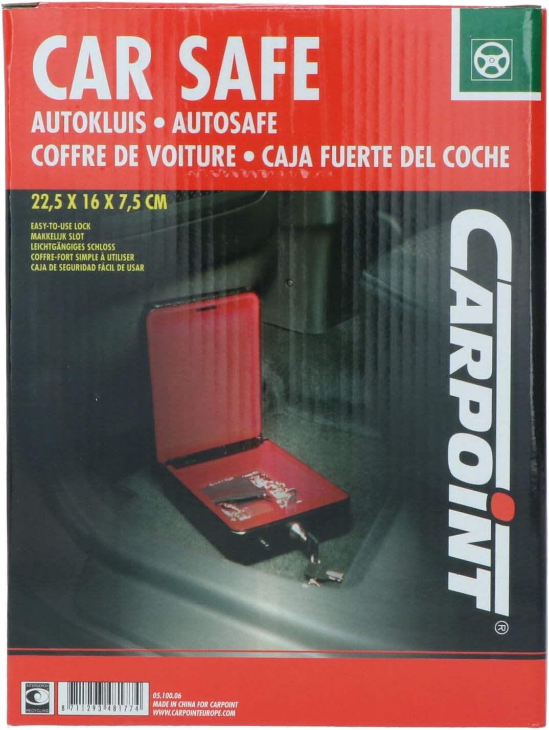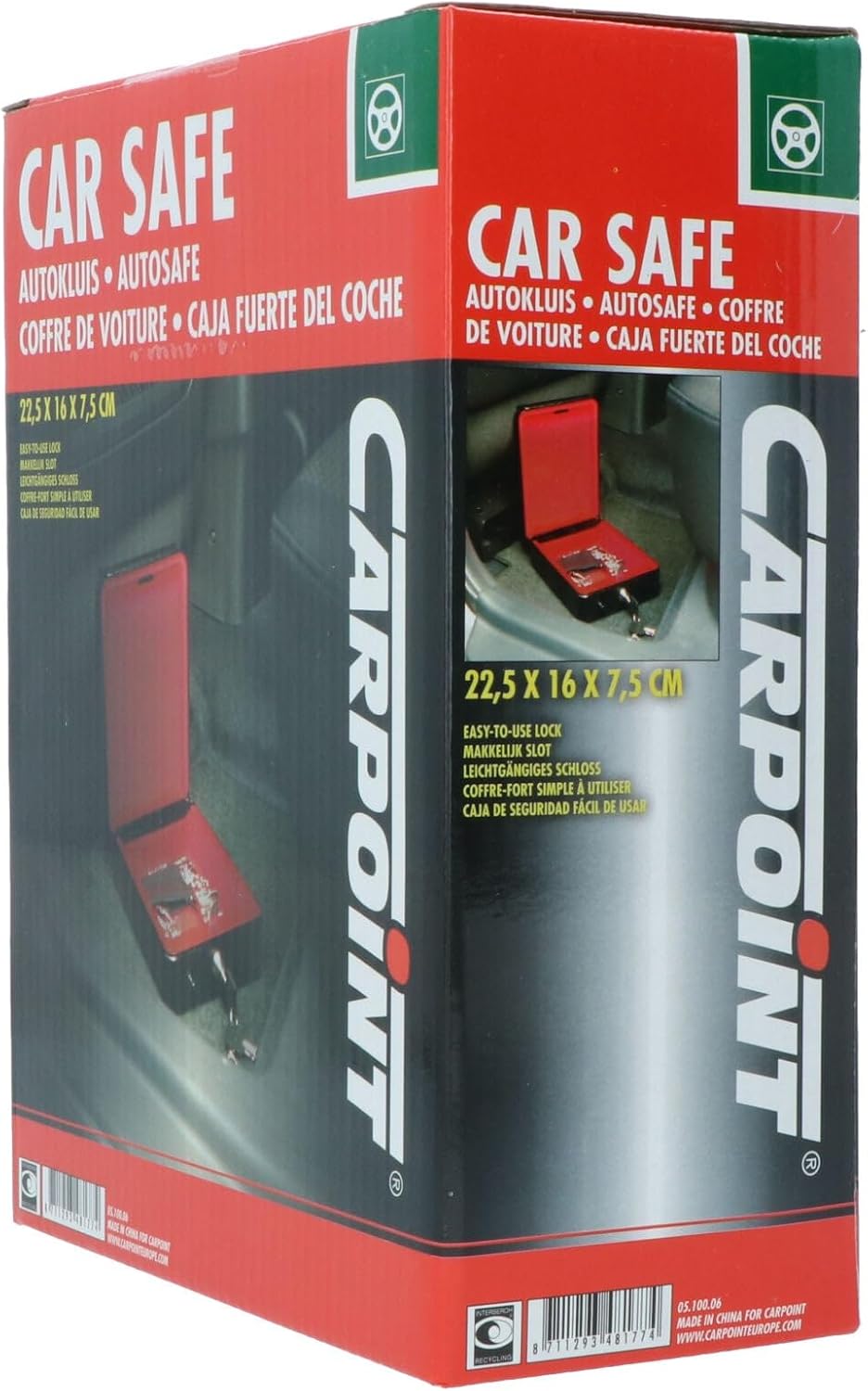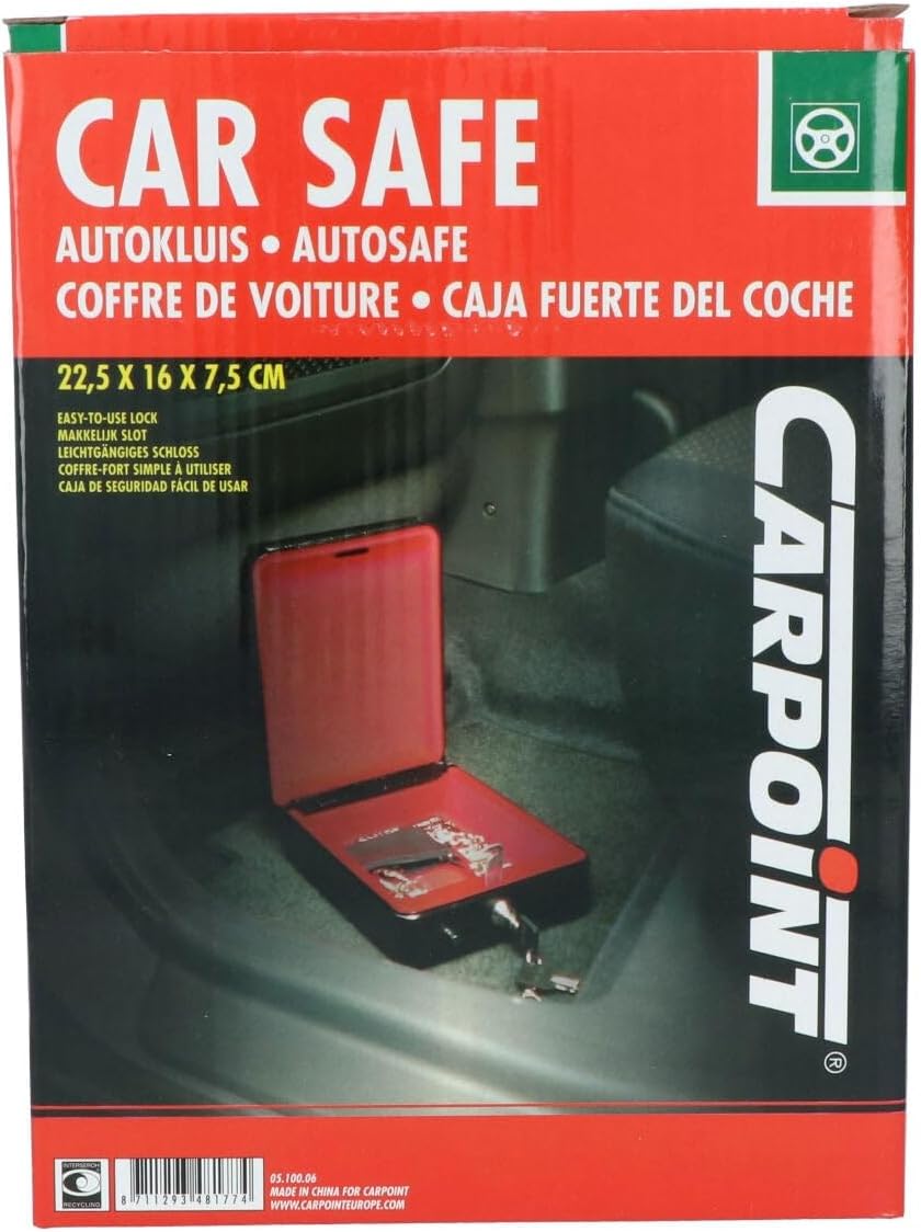 Автомобилният сейф Carpoint е специално проектиран за употреба в автомобили, каравани, кемпери и кемпери. Пари, ценности и лични вещи могат лесно да се съхраняват в сейфа с велурена подплата. Носачът на сейфа може да се монтира дискретно, след което сейфът се плъзга в него и се заключва. Компактният сейф с размери 225 x 160 x 75 мм се предлага с два ключа и монтажни елементи.