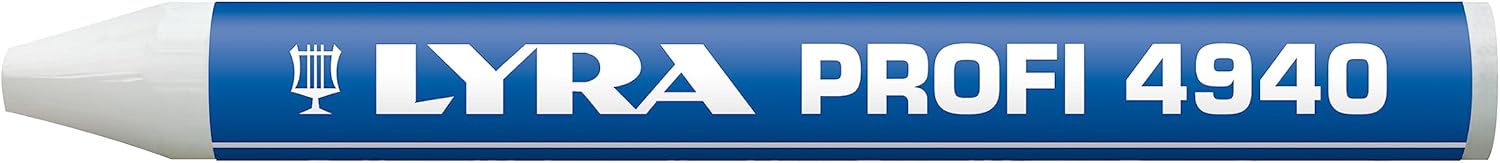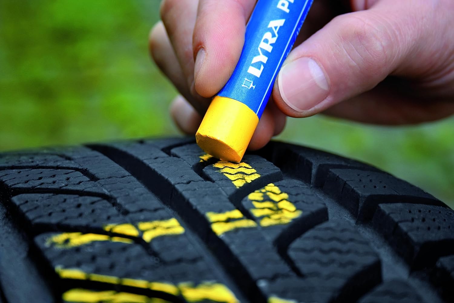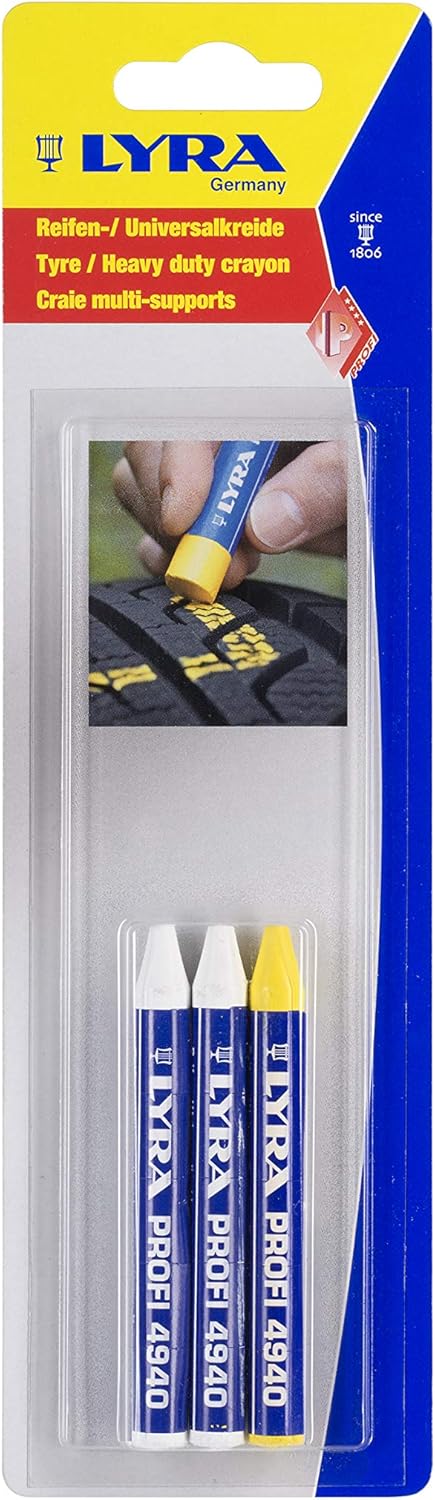 Универсалната тебешир за гуми/кредидж LYRA 4940 е идеална за маркиране, устойчиво на атмосферни влияния, върху много различни повърхности, благодарение на високата си пигментация и висока устойчивост на счупване. Независимо дали става въпрос за ръждясал или омазен метал, сухи или мокри гуми, тебеширът е идеален за професионални маркировки, които са трудни за премахване. С хартиен етикет за чисти пръсти. Тедишът е с кръгла форма и диаметър 9,5 мм, с дължина 90 мм. Тук ще получите блистер с 3 тебешира (2 x бели, 1 x жълт).